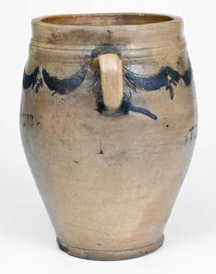Fine One-Gallon Vertical-Handled Stoneware Jar with Impressed Decoration, Stamped "COMMERAWS STONEWARE", Thomas Commeraw, Corlears Hook, Manhattan, NY, early 19th century, ovoid jar with footed base, tooled shoulder, and vertical strap handles, decorated on the front and reverse with an impressed and cobalt-highlighted drape-and-tassel motif. Impressed on front with the cobalt-highlighted name, "COMMERAWS", on the reverse with the word, "STONEWARE", used by African-American potter, Thomas Commeraw, at his stoneware manufactory located on Manhattan's Corlears Hook. Brushed cobalt highlights to handle terminals. Desirable form and maker. Provenance: A fresh-to-the-market example, purchased by the consignor decades ago. A sealed crack extending across underside and approximately 6" up reverse. This vertical crack is crossed over by a horizontal circumferential crack to foot, indicating the base was likely reglued. A faint, approximately 4 1/4" X-shaped surface line, below the name "COMMERAWS", not visible on interior. An in-the-firing stone ping to base and shoulder. An additional base chip. Some fry to cobalt.
