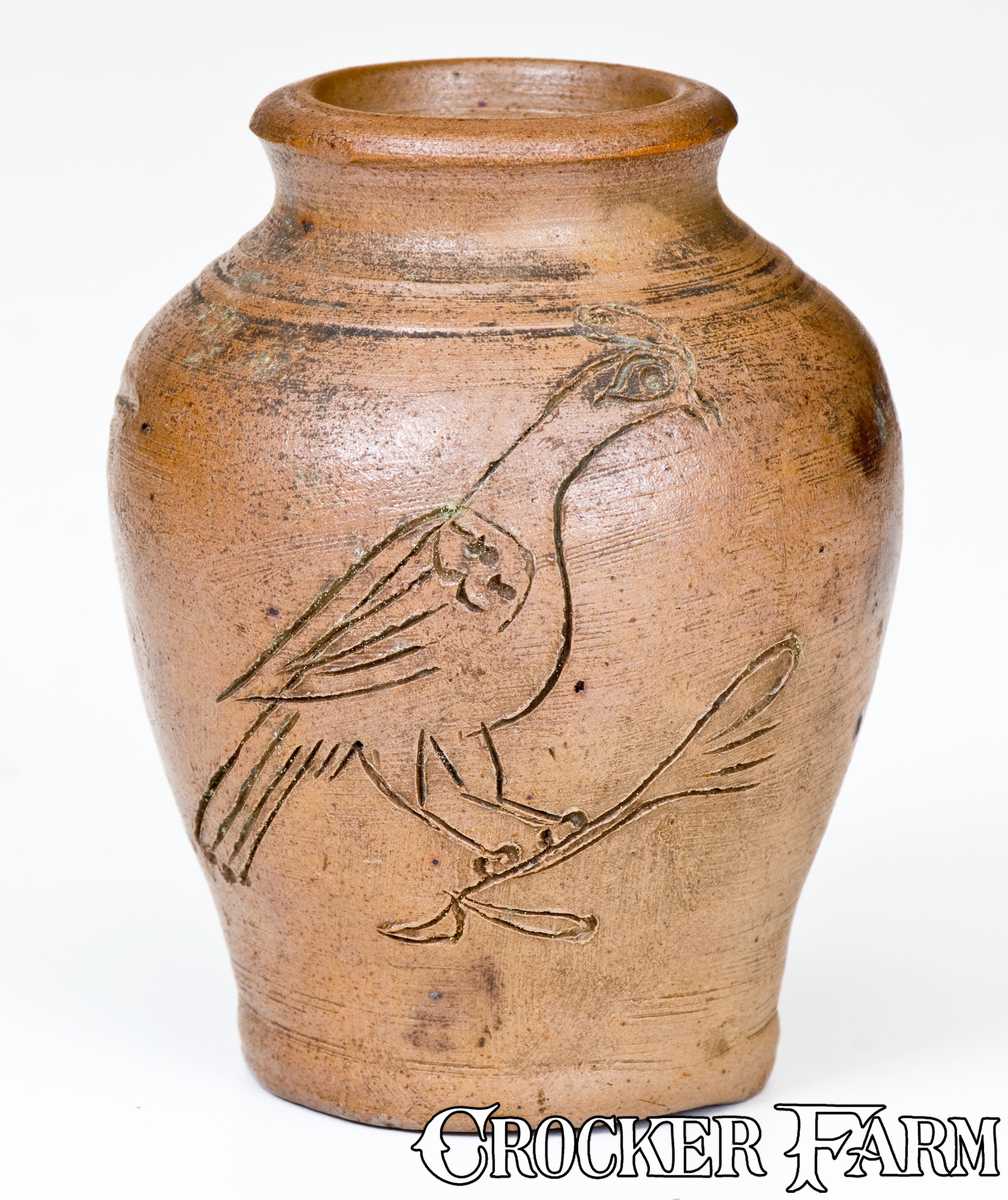 Very Rare Miniature Stoneware Presentation Jar with Incised Bird Decoration, Inscribed "M.F. / 1806", New York State origin, possibly Manhattan or Albany, circa 1806, finely-potted, ovoid jar with footed base, tooled shoulder, and narrow flaring rim, decorated with a large design of a crested bird with long tail, perched on a stylized branch. Incised at shoulder on reverse, "M.F. / 1806". Exceptional size, with a decoration and form loosely based on the Manhattan style. Excellent condition with a minor in-the-firing base chip. H 3 3/4".