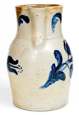 Outstanding One-and-a-Half-Gallon Stoneware Pitcher with Cobalt Floral Decoration, Stamped "JOHN BELL / WAYNESBORO'", PA origin, circa 1850-1880, ovoid pitcher with tooled rim, pronounced pouring spout, and ribbed handle with three thumb impressions at lower terminal, decorated on each side with a free-flowing vine bearing two different styles of tulips, applied over whitish slip. Collar decorated with brushed swags. Handle well-decorated with a curving vine bearing leaves, along with a brushed highlight at its upper terminal. Impressed on collar with John Bell maker's mark above a one-and-a-half-gallon capacity mark. The finest John Bell stoneware pitcher that we have ever offered, this example features an appealing multi-stemmed vine, culminating in the potter's desirable, trumpet-shaped tulip. This design is unusual for this form, usually relegated to larger stoneware jars. Bell's stoneware pitchers, when found, typically involve more formulaic motifs involving a swag-and-hanging-tulip or single-stemmed tulip. An exceptional example of John Bell stoneware, in terms of form, decoration, color, and condition. Excellent condition with a tight 3 5/8" line to left of spout. H 11 3/4".