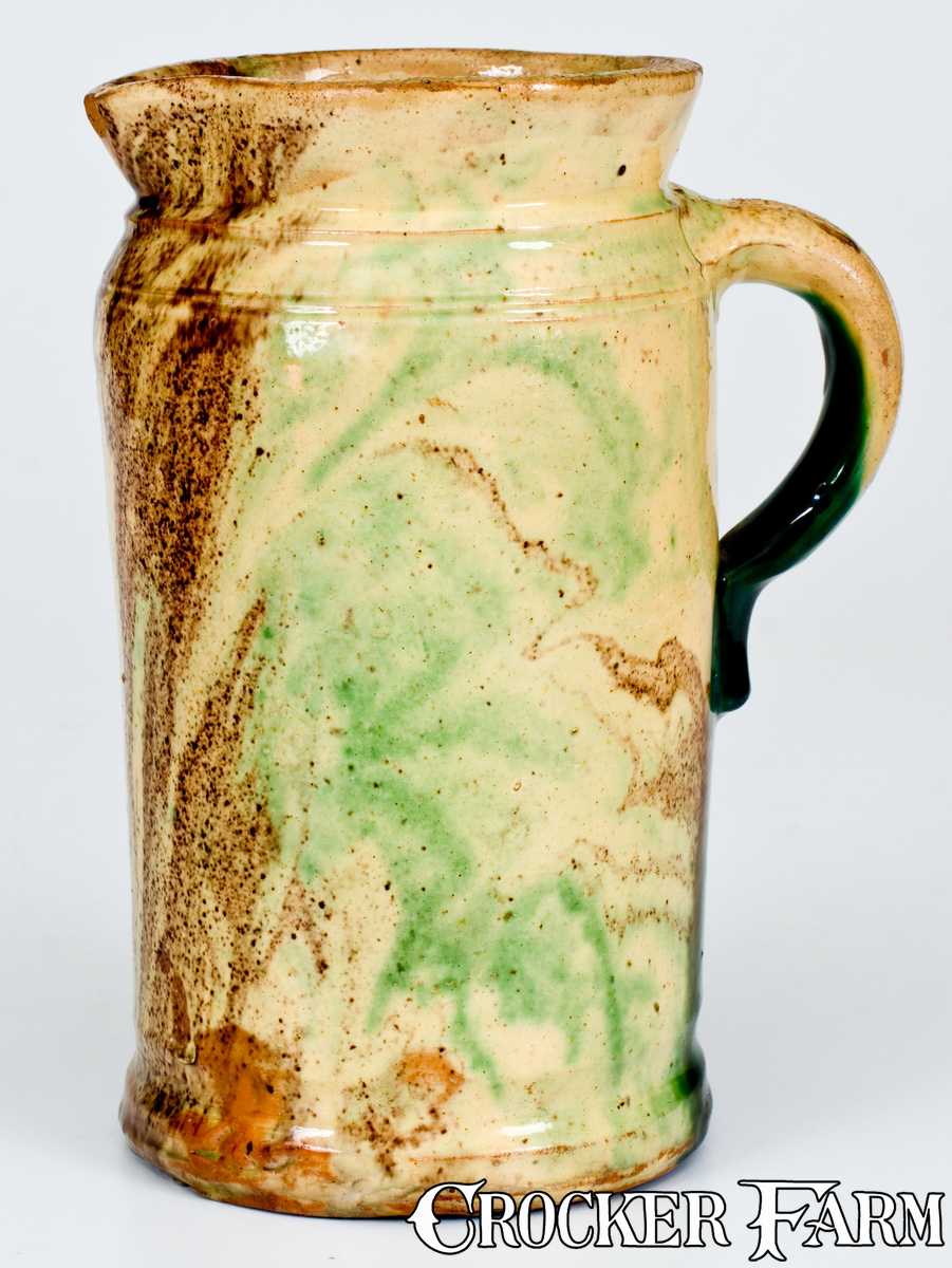 Exceptional Shenandoah Valley Multi-Glazed Redware Tankard Pitcher, attributed to S. Bell & Sons or J. Eberly & Co., Strasburg, VA, circa 1890, cylindrical form with footed base, tooled shoulder, and flared collar, the surface dipped in cream-colored slip, decorated with large, mottled streaks of copper and manganese, and covered in a clear lead glaze. This example is shorter and narrower than most multi-glazed tankards known and its surface is strikingly decorated with marbled glazing in a manner related to the Winchester, VA master potter, Anthony Weis Bacher. A bold drip of copper cascades from the handle. Among the finest Shenandoah Valley tankard pitchers that we have ever offered. A horizontal line to base. Additional lines to interior base, not visible on exterior. A 1 1/4" piece of adhered in-the-firing clay on underside. A small rim chip. A minor rim nick with a tight 4" crack descending from it. H 8 5/8".