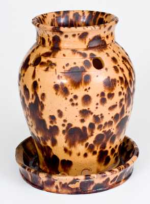 Extremely Rare Glazed Redware Bulb Pot, probably William K. Eby, Conestogo, Ontario, Canada, circa 1875, baluster-form pot with footed base, tooled shoulder, and flared collar, the shoulder fashioned with five carved openings for bulbs. Original drain hole in underside. Surface covered in a light, orangish-tan slip, profusely-decorated with spattered manganese, and covered in a clear lead glaze. Includes original flared saucer with footed base and matching glaze. The distinctive glaze on this vessel indicates it was likely made by William K. Eby, who was born in Pennsylvania and trained in the Pennsylvania-German potting tradition. In 1857, he established a small pottery in the community of Conestogo, located in the Waterloo region of Ontario, which operated until 1907. Exceptional form with striking color. A 2 1/4" x 1 1/2" reglued piece at rim, including an adjacent 3/4" rim chip and two tiny flecks of clay missing along crack line. This damage includes a 3 1/4" X-shaped hairline descending from it. An additional shallow 5/8" rim chip. A 3" loss to rim of saucer. An approximately 1 1/4" chip to exterior of rim of saucer. Some glaze flakes to saucer. Two small base chips. H (including saucer) 10".