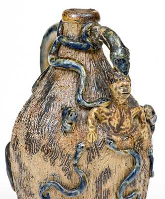 Extremely Rare Cobalt-Decorated Stoneware Temperance Jug with Applied Figural Decoration, attributed to Simeon L. Bray, Evansville, IN, circa 1885, ovoid jug with tall neck and rounded spout, the handle in the form of a large snake devouring a hand-modeled figure of a man with pained expression, whose torso and arms extend from the front of the vessel. Surface of jug decorated with several animals facing the central tortured figure, including a frog to the left, a lizard to the right, and three snakes below. Two larger snakes appear above, one which curls around the neck of the snake handle and rests its head on the figure's shoulder, the other which lays atop the the midsection of the snake handle and appears behind the figure. Incised details to animal's faces and body of figure. Surface of jug heavily-incised with a rustic, bark-like texture. Animals heavily-decorated with brushed cobalt slip and overlying Albany slip spots. Body of jug profusely-decorated with reddish-brown slip brushwork, presumably iron-oxide. Applied figure decorated with reddish-brown slip highlights to hair and lighter-brown, Albany slip highlights to his torso. Brothers, Simeon, J. Wallace, and William Bray, spent their early years in the town of Anna, Illinois, where they likely learned the pottery trade from the famed Kirkpatrick brothers. This work is one of a small number of Anna-inspired temperance jugs known by this family. It is noteworthy in its use of cobalt slip decoration, being one of a very few known with this treatment, as well as its size, measuring among the largest Bray temperance jugs known. The elaborate modeling of the figure's torso and head are also remarkable, as the majority of documented Bray family jugs feature only a simple man's head emerging from the jug's wall, or, in some cases, no representation of a human form at all. The inclusion of several crawling animals and an expressive face on the tormented man make this piece a particularly lively and expressive Bray work. Additionally, the jug's detailed torso and use of cobalt decoration make this example a truer copy of the Anna style than most Bray family pieces known. Provenance: A previously-undocumented, recently-surfaced example. Very old, possibly late 19th or early 20th century, plaster restoration to a section of the neck of the snake handle, which emerges from the jug's neck, as well as the head of the lizard. Head of human figure reglued to his body. Loss to figure's nose. H 7 3/4".