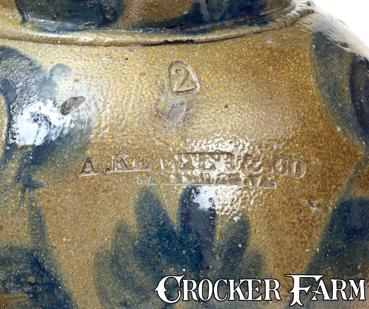 Very Rare Two-Gallon Stoneware Pitcher with Profuse Cobalt Floral Decoration, Stamped "A. KEISTER &. CO. / STRASBURG, VA", circa 1850, ovoid pitcher with tall, narrow collar and heavily-beaded rim, the front decorated with a brushed design of an open-centered tulip surmounted by a fan-shaped blossom, flanked by two additional tulips emanating from leafy stems. Large oval cobalt brushwork flanks the spout and a cobalt band highlights the rim. Impressed on body with the maker's mark, "A. KEISTER &. CO. / STRASBURG. VA.", below a raised-face two-gallon capacity mark. The stamp of Adam Keister, Sr., as seen on this pitcher, is among the most desirable maker's mark from the prolific potting town of Strasburg, VA. Signed pitchers by this maker are considered very rare. The desirability of this example is further strengthened by the pitcher's high decorative appeal, which include a large two-gallon capacity and bold floral design related to the work of Shenandoah Valley master, Solomon Bell, with whom the Keister family associated. Excellent condition with some minor rim chips and some typical, small in-the-firing flaws to surface. H 14".