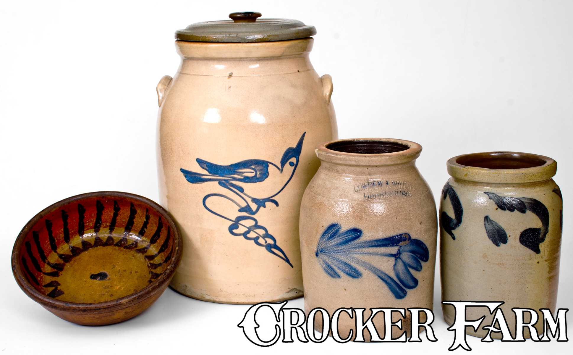 Five Utilitarian Pottery Pieces, American, 19th century, a three-gallon Bristol-slip-glazed jar with cobalt bird decoration, attributed to the Fulper Pottery, Flemington, NJ; a half-gallon stoneware jar with cobalt swag decoration, attributed to Richard C. Remmey, Philadelphia, PA; a half-gallon stoneware jar with cobalt floral decoration, stamped "COWDEN & WILCOX / HARRISBURG, PA"; a glazed redware bowl with sponged manganese striping, probably PA origin; and a salt-glazed stoneware lid, Northeastern U.S. origin. Bird jar with a 4 1/2" inverted Y-shaped crack from rim, ending at one handle terminal, some faint lines on underside, not visible on interior, and some minor rim chips. Remmey jar in as-made condition with some fry to cobalt. Cowden & Wilcox jar with two rim chips, a salt drip to underside, a faint 1 1/2" hairline from rim on front, some fry to cobalt, and some staining. Redware bowl with wear and a crack from rim. A salt drip and minor chipping to lid.