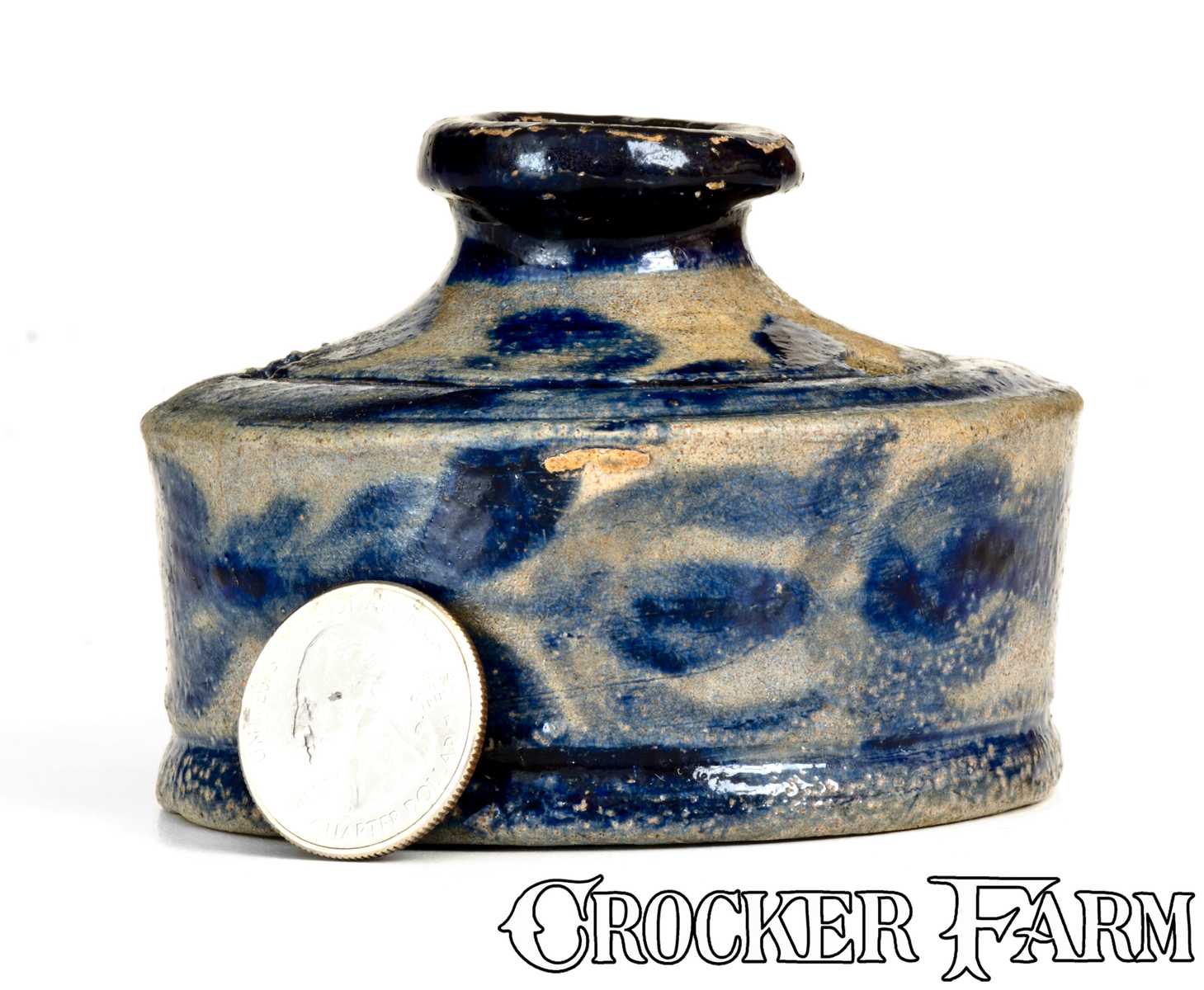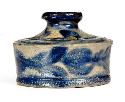 Exceedingly Rare and Important Stoneware Inkwell with Profuse Cobalt Floral Decoration, attributed to David Parr, Sr., Baltimore, MD, circa 1825, cylindrical form with footed base, tooled accents, and raised spout with rounded mouth, the top pierced with three quill holes. Circumference of inkwell lavishly-decorated with brushed tulips emanating from leafy stems. Top with heavy cobalt swag decoration surrounding the cobalt-highlighted spouts. Foot of inkwell decorated with a cobalt band. This inkwell is among the finest works known by the highly-influential Baltimore potter, David Parr, Sr., whose style radiated throughout the Mid-Atlantic and South during the second and third quarters of the 19th century. Parr is distinguished as one of the first American potters to decorate his ware with elaborately-brushed floral motifs, evidently recognizing the importance of artistry in making a saleable product. This inkwell typifies Parr's propensity for canvasing his work with cobalt slip and is one of a relative few examples of 19th century American stoneware that may actually feature more brushed cobalt than undecorated clay ground. One of only two Parr inkwells of this style recorded and likely the finer of the two, this example is also among the earliest cobalt-decorated examples of the form known in Southern stoneware production. Excellent, essentially as-made condition with a tiny bit of adhered clay to shoulder and some light spalling to the heavily-applied cobalt slip at the spout. H 2 3/8" ; Diameter 3 1/4".