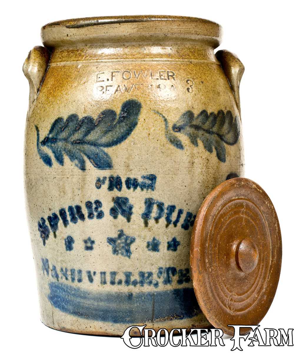 Rare Three-Gallon Lidded Stoneware Jar with Cobalt Foliate Decoration with Nashville, Tennessee Advertising, Stamped "E. FOWLER / BEAVER, PA", circa 1870, semi-ovoid jar with tooled shoulder, semi-squared rim, and applied lug handles, featuring the stenciled cobalt advertising, "FROM / SPIRE & DUFF. / NASHVILLE, TENN.", including five stars at the center. Cobalt foliate motifs to shoulder. Wide cobalt stripe below. Large brushed "3" to right of advertising. Decoration is applied over a slip-coated surface. Includes salt-glaze stoneware lid, stamped "3" and "4". A difficult-to-find example of Western PA stoneware made for the Southern market. A tight fork-shaped crack in underside, continuing onto base in four places. A 1 5/8" chipped area to left handle. A chip to right handle. A chip to interior of rim. A small chip to tip of finial on lid. Jar does not sit perfectly flat.