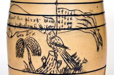 Five-Gallon Stoneware Water Cooler with Elaborate Incised Decoration of a Bird-on-Stump with American Flag, Inscribed "Shoot the first man who pulls down this flag/ Gen Dix", Stamped "F.T. WRIGHT & SON / TAUNTON, MA", 1861, semi-ovoid cooler with circular bunghole, the surface profusely-decorated with incised and cobalt-highlighted banding. The front features an elaborate incised and cobalt-accented design of a bird-on-stump with large American flag, flanked by grasses, a willow tree, and a tulip. A large, forked banner emanates from the bird's mouth, reading, "Shoot the first man/ who pulls down this / flag". The name "Gen Dix" appears below. Impressed below rim with the cobalt-highlighted maker's mark of Taunton, Massachusetts, potter, Franklin T. Wright, and his son. This cooler bears the quotation of Union Civil War General and current Treasury Secretary, John A. Dix (1798-1879), taken from a January 29, 1861 telegraph he sent to the lieutenant of a Union ship, McClelland, that was under threat of seizure by secessionists in New Orleans, Louisiana. The telegraph was intercepted by an operator in Montgomery, Alabama, who, instead of forwarding the message to the ship's lieutenant, sent it to secessionist leaders in New Orleans. The telegraph was leaked to the press and made front page headlines in both the North and South, inciting a variety of responses. Despite the threat, the McClelland was captured. The fiery quotation would become Dix's legacy, used as a slogan on banners, becoming the inspiration for poems, and even the subject of a song titled, "Shoot Him On the Spot". By Spring of 1861, President Lincoln had appointed Dix to serve as one of the Union's leading generals, sending him to Baltimore to implement strict anti-secessionist policies. Later that year, the McClelland was retaken by the Union, and Dix was gifted both the Union flag that was taken down from the ship and the Confederate flag that it had been replaced with. The slogan would be associated with Dix for the rest of his life. When he ran for Governor of New York in 1872 (later winning handily), newspaper headlines read, " 'OLD SHOOT HIM ON THE SPOT' NOMINATED FOR GOVERNOR' ". [The above information regarding John A. Dix's legacy provided by Adam Goodheart, author of "1861: The Civil War Awakening" and Hodson Trust-Griswold Director of Washington College's C.V. Starr Center for the Study of the American Experience.] Despite the Civil War's immeasurable impact on America during the early 1860s, very few examples of American stoneware are known with such a vivid reference to this period in our history. Among the most significant discoveries in early Massachusetts pottery in recent decades. Provenance: A recently-discovered example, found in a New England home. Chipping to interior of rim. Two short, in-the-firing surface lines from bunghole, not visible on interior. Two very minor chips to underside at edge. H 14 1/2".