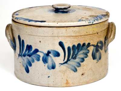 Lidded Stoneware Cake Crock with Cobalt Floral Decoration, attributed to Henry H. Remmey or Richard C. Remmey, Philadelphia, PA, circa 1865, cylindrical form with heavily-tooled shoulder, squared rim, and ribbed lug handles, decorated with two large drooping floral motifs on the front and reverse. Cobalt highlights to handle terminals along with a wavy line of cobalt underneath each handle. Includes a loosely-fitting lid, impressed "5" on underside and not original to the crock, decorated with brushed swags and a cobalt highlight around the knob. Crock with a vertical in-the-firing separation to interior, not visible on exterior. Additionally, a 1 3/4" separation to exterior of rim, not visible on interior. A tiny chip and minor ping to interior of rim. Lid with a 1 1/4" x 3/4" loss to edge with a short in-the-firing crack extending from it, a chip to knob, and a chip and some short lines to flange on underside. H (of crock including lid) 7 1/2" ; Diam. (of crock) 9 3/4".