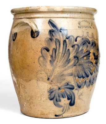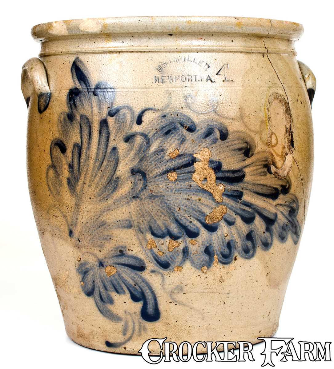 Rare 4 Gal. M. & T. MILLER / NEWPORT, PA Stoneware Jar w/ Leaf and Floral Decoration