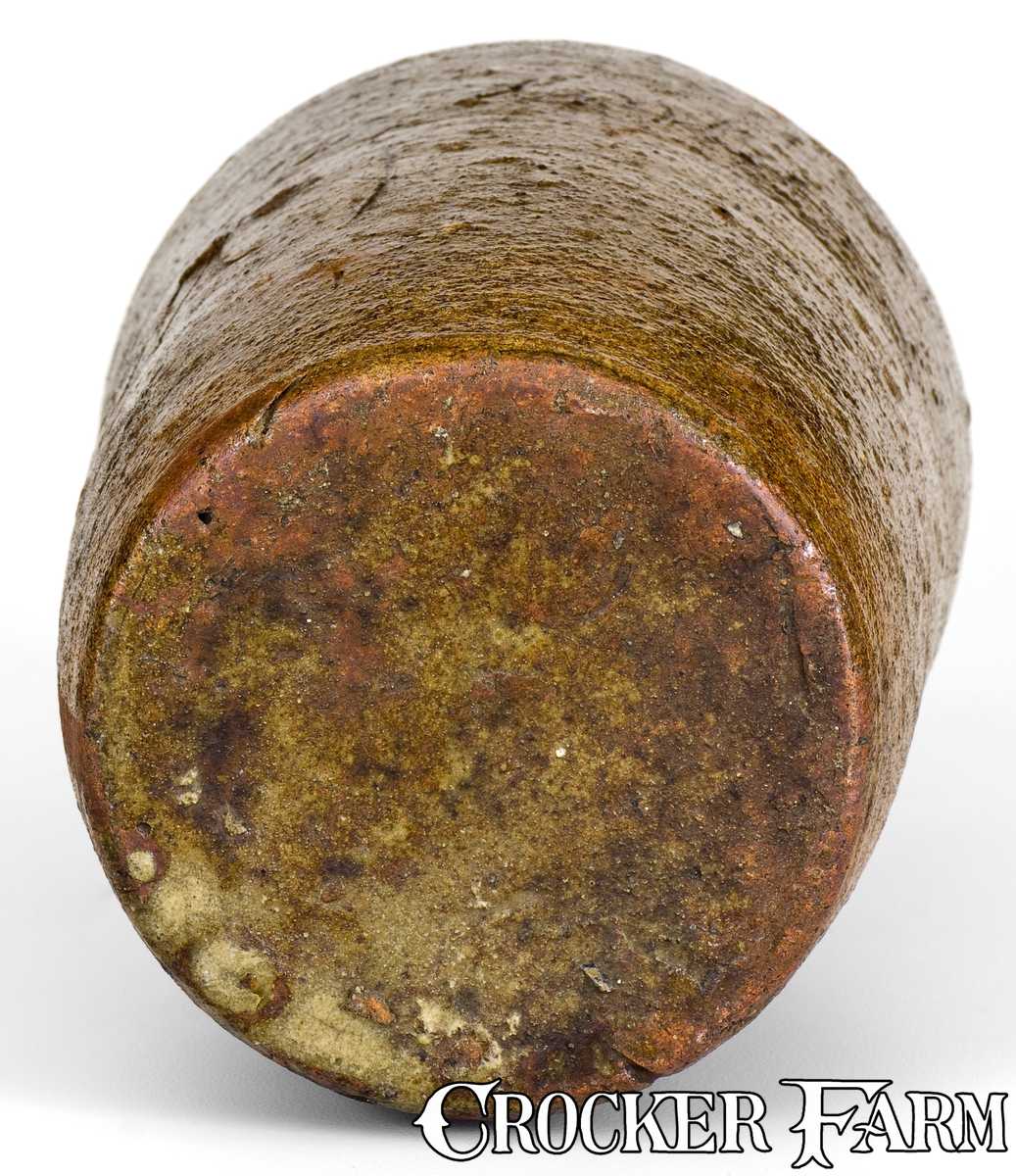 Very Rare Alkaline-Glazed Stoneware Canning Jar, Inscribed "When this you see Remember me / T M J," South Carolina origin, circa 1870-1880, small-sized, semi-ovoid jar with rounded shoulder, flared rim, and inner rim to hold a lid. Surface covered in a mottled olive alkaline glaze with varying degrees of luster. Incised around the midsection with the script inscription, "When this you see Remember me / TMJ." The incised poetic couplet on this jar is in keeping with the style of renowned enslaved potter, Dave, who potted for several decades in South Carolina's Edgefield District. Based on the jar's initials, it may have been made by free black potter, Thomas Jones, born circa 1852, who is listed in the 1870 U.S. Federal Census as working in South Carolina's Edgefield District at the "Jug factory" (Miles Pottery) along with Dave. Another possible maker is free black potter, Mark Jones, circa 1835, who worked with Dave at Lewis Miles Pottery and collaborated with him on at least one piece inscribed "Dave and Mark", now in the collection of the Smithsonian Institution. (Mark Jones, along with his wife, Caroline, is listed as living with Dave in the 1870 census and is perhaps his son-in-law.) This jar may have also been made in Upstate South Carolina, where related canning jar forms were more typically produced. Excellent, essentially as-made condition. H 8".