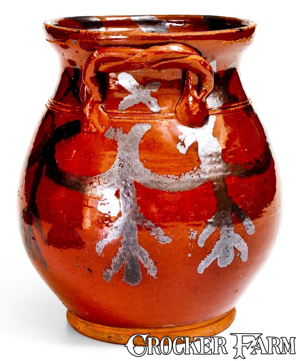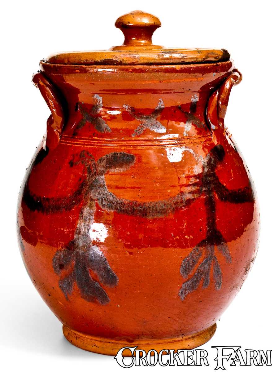 Outstanding Lidded Redware Jar with Rope-Twist Handles and Profuse Manganese Decoration, attributed to David Mandeville, Circleville, NY, circa 1835, ovoid jar with footed base, tooled shoulder, flared rim, and delicately-applied rope-twist handles; decorated around the body with a distinctive brushed manganese drape design featuring ram's-horn scrollwork and a hanging tassel or foliate device. Shoulder decorated with three brushed X's on each side. Surface covered in a clear lead glaze. Includes a rare David Mandeville redware lid with daubed manganese under a clear lead glaze, slighly oversized for the jar. Provenance: A fresh-to-the-market lot, purchase by the consignor decades ago. Jar in strong condition, particularly for this maker, with some expected wear to rim, two small rim chips, and light wear to handles. Lid in excellent condition with a shallow 1 1/4" edge chip. H (excluding lid) 9" ; Diam. (of lid) 5 3/4".