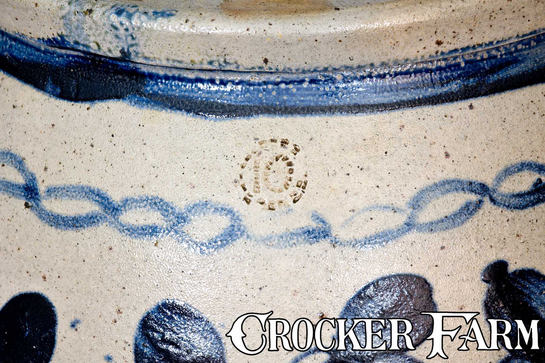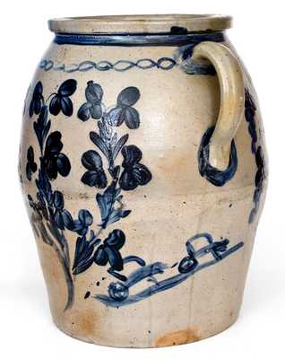 Monumental Ten-Gallon Stoneware Jar with Profuse Cobalt Clover, Chainlink, and Wheelbarrow Decorations, Baltimore, MD origin, circa 1840, ovoid jar with squared rim and vertical open handles, lavishly-decorated on the front and reverse with a large triple-stemmed flowering plant extending from base to shoulder. One side depicts the plant bearing classic Baltimore clover designs and the other side depicts a clover variant resembling wisteria, another popular regional motif. A highly unusual design of two wheelbarrows descending a hill to the base of each plant appears on opposing sides below the handles. Shoulder decorated on each side with a brushed cobalt band above a series of chain links. Circular cobalt brushwork highlights the handle terminals. Impressed "10" within a dashed circular border. Featuring an imposing size and unusual double-handled form, this jar is among the most heavily-decorated examples of Baltimore clover-decorated stoneware known. Putting this work in a class unto itself is the addition of wheelbarrow motifs flanking the plants, images which speak to the vessel's use in an agrarian context on a Virginia farm. While the vessel's exact purpose is unknown, its special size may relate it to the large "plantation jars" produced in alkaline-glazed ware further South. Provenance: Originally owned by the Coons Family, North Cliff Farm, Culpeper, VA; later owned by a Charlottesville, VA lady; Jeffrey S. Evans & Associates Auctions, Nov. 14, 2009, lot 20. One handle professionally-restored. Otherwise excellent condition with the following minor flaws: a vertical in-the-firing glaze drip to one side, some staining, minor base chips, and an area of short tight lines from rim. H 19".