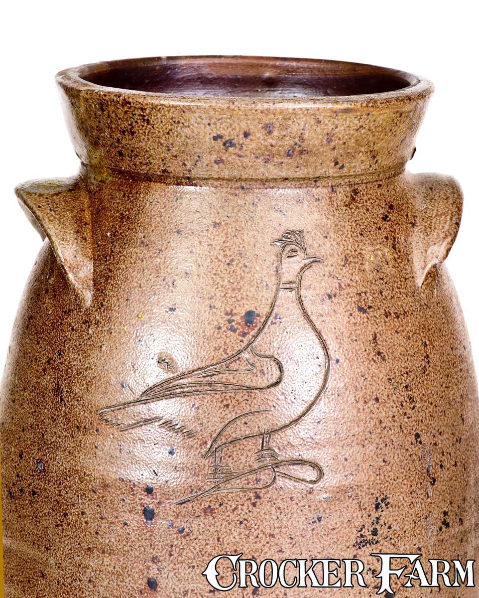 Extremely Rare Four-Gallon Stoneware Churn with Incised Bird Decoration, attributed to John Floyd, Knox County, TN or OH origin, circa 1840-1860, semi-ovoid churn with flared collar and arching tab handles, decorated with a distinctive incised design of ring-necked bird with crest, perched on a stylized leaf. Reverse incised "4," indicating four gallons. The incised bird design on this churn matches that found on a documented water cooler dated "1842" and attributed to potter, John Floyd, at the Graves Pottery of Knox County, TN. The cooler was exhibited beside a second, signed John Floyd cooler at "Tennessee Turned: Earthenware and Stoneware Made in East Tennessee, circa 1800-1900," held at the Museum of East Tennessee History in 2011. A closely-related bird cooler, dated 1840, was also sold in Crocker Farm, Inc.'s October 22, 2016 auction, lot #458. Floyd was an itinerant potter who worked in both Tennessee and Ohio. As this churn is not dated, it is difficult to determine which state it was made in. Nevertheless, the bird is undeniably in this potter's hand. A 2 1/2" x 1 7/8" restored section to rim above left handle, including a 1 1/4" hairline descending from it. A slightly-raised area on underside.