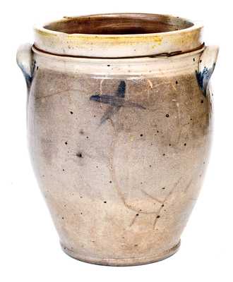 Very Rare One-Gallon Stoneware Jar with Cobalt "Turnip" Decoration, Stamped "W. NICHOLS. / PO,KEEPSIE," NY State origin, circa 1823, ovoid jar with tooled shoulder and small lug handles, decorated on the front with William Nichols' distinctive brushed "turnip" motif, and on the reverse with an X. Cobalt highlights to handle terminals. The Athens, NY-trained potter, William Nichols, established his Poughkeepsie pottery in 1823 and tragically died later that year at the age of twenty-five. As this maker's mark was likely only used for several months, few signed examples of Nichols' Poughkeepsie work are known. Each marked object is considered a noteworthy artifact of a skilled potter's short career in a prolific, stoneware-producing city. Provenance: A fresh-to-the-market example, from a forty-year private collection. Large spider crack descending from rim on left side of jar's front, which splits, extending further onto jar's front in one direction as well as through left handle in another direction. Rim chips. Rim secured with a wire. Cracks to reverse and small flakes to shoulder on reverse. Some mottling to surface.
