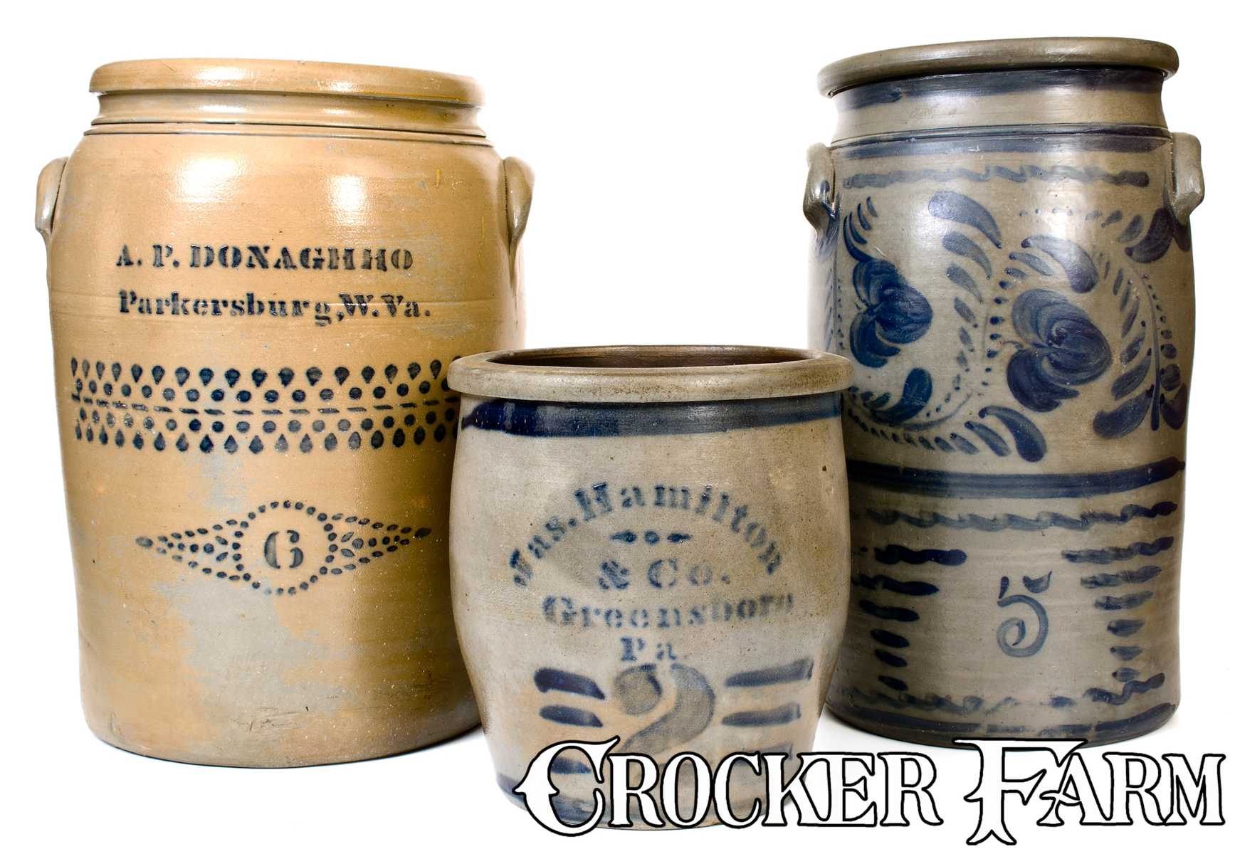 Lot of Three: A. P. DONAGHHO / Parkersburg, WV Stoneware Jar, Greensboro, PA Vessels