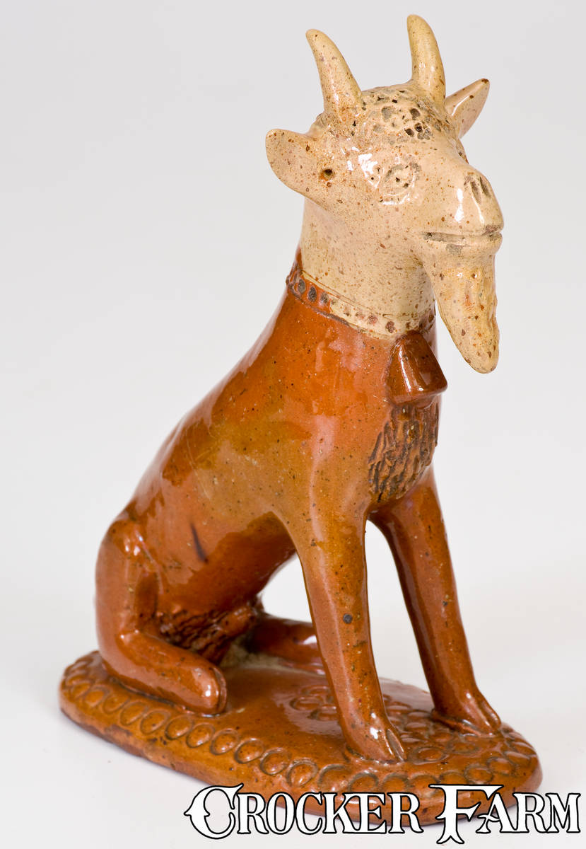 Exceedingly Rare and Important Large-Sized Redware Figure of a Goat, PA origin, circa 1850-1880, hand-modeled figure of a goat with incised collar, applied bell, and incised details to head, chest, and hooves, seated on an oblong base embellished with impressed circles. Head of goat features rare, dipped cream-colored slip treatment. Entire surface covered in a clear lead glaze. Pieces of clay added to the interior of the goat prior to firing allow it to rattle when shaken. Among the rarest and most striking forms in the genre of Pennsylvania redware animal figures, this example is modeled in an appealing large size. The redware seated goat form gained notoriety when a highly important example signed by Winchester, VA master potter, Anthony Bacher, crossed the block at Sotheby's sale of "Important Americana: The Collection of Dr. and Mrs. Henry P. Deyerle" on May 26 and 27, 1995. The Pennsylvania example to be sold in this auction is one of the more noteworthy recent offerings in American ceramic folk sculpture. Very few examples have been documented. Professional restoration to horns, ears, goatee, bell, and tail. Additional restoration to section of front of base, not affecting feet of animal. Some restoration paint visible to head. A small, unrestored flake to neck on reverse. H 6 1/2" ; L 5 1/8".