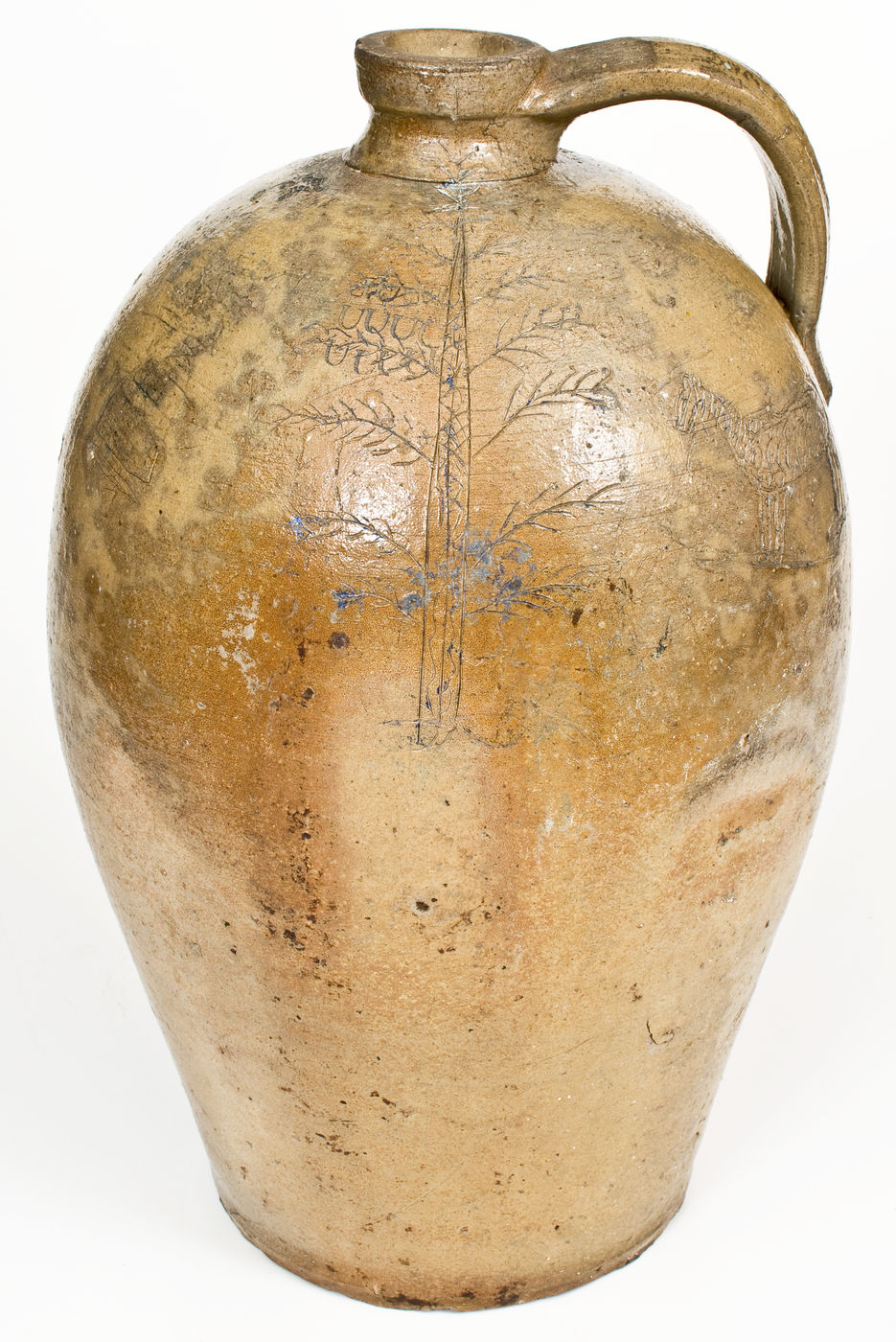 Outstanding Ohio Stoneware Jug w/ Elaborate Incised / Impressed Designs incl. Horse, Tree and Woman Motifs