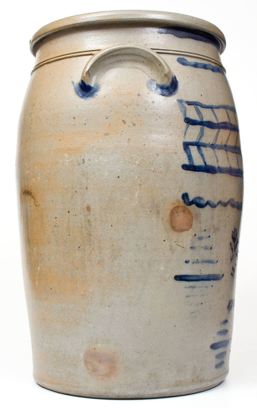 Exceptional Sixteen-Gallon Cobalt-Decorated Stoneware Jar, Stenciled "R.T. WILLIAMS / NEW GENEVA, PA," circa 1880, large-sized, cylindrical jar with tooled shoulder, semi-rounded rim, and applied lug handles, featuring a highly unusual zig-zagging freehand band between freehand stripes. R.T. Williams maker's stenciling below, flanked by stenciled tulips and graduated freehand dashes. Base inscribed with a freehand "16," flanked by additional graduated dashes. Cobalt highlights to handle terminals. The first Western Pennsylvania piece decorated in this manner that we have offered. Excellent condition with three small chips to shoulder molding on front, a small chip to one handle, and some minor surface wear. H 23 1/2".