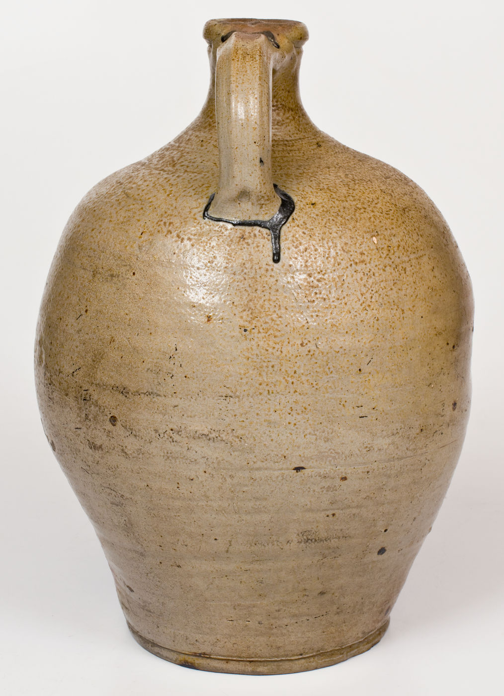Very Rare Two-Gallon Cobalt-Decorated Stoneware Jug, attributed to Adam States, Sr., South Amboy, NJ, Manhattan, NY, or Greenwich, CT, mid 18th century, highly-ovoid jug with footed base, tall spout with tooled mouth, and ribbed handle, decorated on the front with a slip-trailed cross with spot inside each quadrant. Slip-trailed highlights to handle terminals. The form, spout construction, and dark, thickly-applied slip, are all consistent with the work of Adam States, Sr., a potter active during the mid 18th century in South Amboy, Manhattan, NY, and Greenwich, CT. In the final period of his career, States established a long-standing pottery in Greenwich, CT, which was managed upon his death in the 1760s by an apprentice, Abraham Mead (Goldberg, Warwick, and Warwick, Ceramics in America 2008, p. 35). Today, Mead is recognized among scholars as one of the most skilled and well-documented American stoneware potters of the 18th century. The form and color of this jug are closely-related to those found on a highly important miniature jug, incised "S +" and attributed to States's Manhattan period, which sold as lot 66 in Crocker Farm's March 25, 2017 auction. Provenance: A fresh-to-the-market example, purchased by the consignor decades ago. Base chips. Otherwise excellent condition with some typical in-the-firing flaws. H 13 1/2".