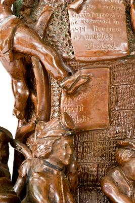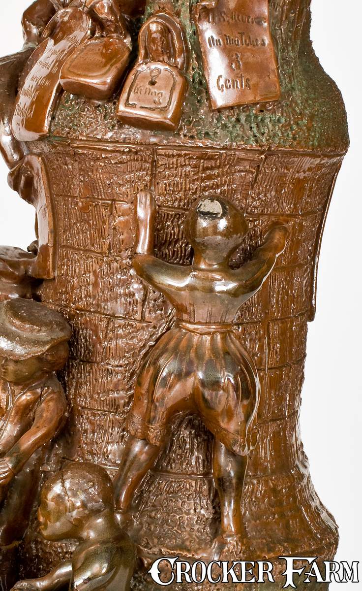 Potted in the shape of a monument with hand-incised bricks emanating from a rustic mound, this previously-unknown form relates to Anna Pottery's iconic aquarium castles. Serving as a social commentary on the American Reconstruction Era, the primary subject of the sculpture is the Colfax Massacre, today viewed as the largest lynching in American history. On Easter Sunday in 1873, as many as 153 African-Americans were slain at the Grant Parish Courthouse, located in Colfax, Louisiana. Republican black militiamen had occupied the courthouse as a result of a hotly-contested Louisiana gubernatorial election, one marked by fraud on the part of white supremacist Democrats. Despite surrendering, the militiamen were killed at the courthouse at the hand of a white Democrat mob, which included ex-Confederates armed with rifles and a small cannon. The Kirkpatricks' sculpture depicts this tragedy in vivid detail, with two white figures, armed with a rifle and pistol, one wearing a Confederate forage cap, pressing their weapons against a black man and woman, who are covering their eyes in anguish and fear. A third black figure kneels with his arm on a child, in an attempt to shield her from the violence. The Kirkpatricks, in their typical sarcastic fashion, have placed a plaque below the figures reading, "Our protection under the Civil right Bill," referring to the "Civil Rights Act of 1866," the first U.S. Federal law stating that citizens of all races had equal protection under the law. A second broadside beside the figures reads "Freedom in Louisiana." Another figure, a black woman related to those found on Anna's shoo fly jugs, attempts to scale the tower towards a padlock, or possibly a ballot box, inscribed "Kellogg," for William Pitt Kellogg, the Republican gubernatorial candidate of 1872. (Fraud was rampant during this election. Among the obstacles faced by blacks was a requirement for voters to prove an age of 21 to vote, despite the fact that former slaves were never given birth certificates.) Even higher on the tower is a molded figure of a reclining lion, inscribed "USG," for President Ulysses S. Grant. Lions produced from the same mold can be found on much smaller Anna works. In this case, the lion serves as a symbol of Grant's strength and nobility as the leader of a recovering nation. A second padlock or ballot box, inscribed "Last / Chance," hangs over the lion's paw, stating, in plain terms, that Grant is the last chance for creating a successful and virtuous country. The tower's peak is surmounted by a molded figure of the goddess Liberty, in classical dress, wearing a liberty cap, with outstretched arm. An original piercing in her raised hand suggests she may have been designed to allow the owner to insert a miniature wood-and-cloth American flag, if so desired. This figure, the personification of the concept of liberty in its purest form--one free from the influence of politics--is the only figure depicted above Grant (the lion). The depiction of a black woman ascending a tower to vote serves as an allegory for the difficulties African Americans faced within the Reconstruction era voting system. However, more broadly speaking, her ascent can be seen as an attempt at reaching an even greater goal at its apex: Liberty. The Colfax Massacre has gained significant recognition in this century as a pivotal moment in our nation's history.