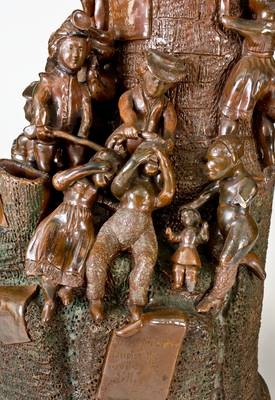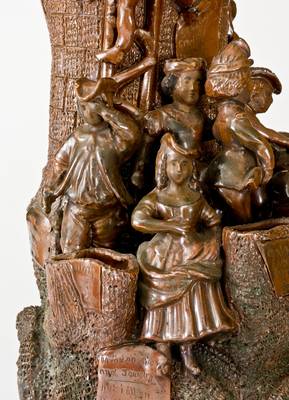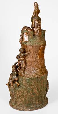 Highly Important Anna Pottery Stoneware Liberty Monument with Applied Figural Decoration, Wallace and Cornwall Kirkpatrick, Anna, IL, 1873, a large work composed of connected, wheel-thrown cylinders brimming with molded, hand-modeled, and applied clay figures. Several applied clay broadsides appear throughout the sculpture, incised with various slogans. Surface covered in an Albany slip glaze with glass runs to base and green-glazed highlights to the upper body. This recently-discovered folk sculpture by two of the nation's most celebrated ceramicists is perhaps the most historically significant, racially progressive, and politically charged example of American pottery known.