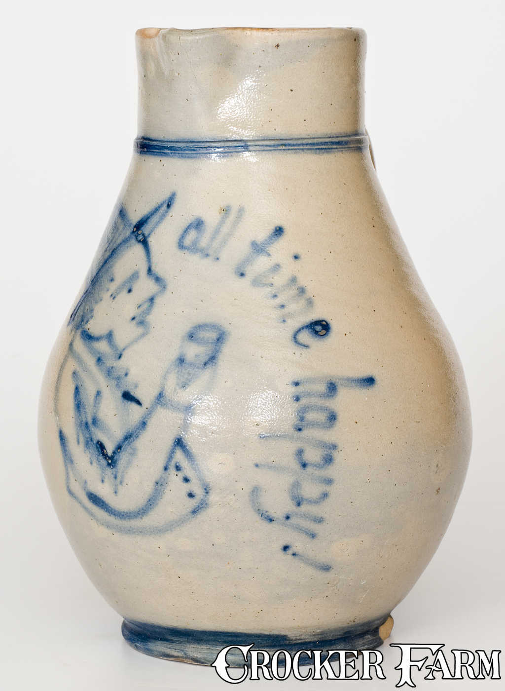 Outstanding Stoneware Pitcher with Freehand Cobalt Decoration of a Hatted Man Raising a Glass, Inscribed "all time happy!," attributed to William Macquoid, Manhattan, NY, circa 1870, ovoid pitcher with footed base and short, narrow collar, decorated with a large brushed design of a hatted man raising a glass, facing the arched inscription, "all time happy!" Cobalt banding to foot and base of collar. This pitcher, bearing a distinctive Macquoid motif, was likely made to serve beer, its whimsical inscription presumably referring to the enjoyment of strong drink. Macquoid is known for producing some of the most extravagant and unusual figural designs in all of American stoneware. Featuring an outstanding design considered rare on any form, this work is truly exceptional as very few figural-decorated pitchers from this pottery are known. Also of note is the exceptionally large size of the decoration and inscription, which have excellent coverage over the vessel's front. A 4" vertical crack from rim on reverse. A 1 3/8" vertical crack to spout. A 1 1/4" chip to foot on side of pitcher. Some very minor spots of fry to cobalt. H 11".
