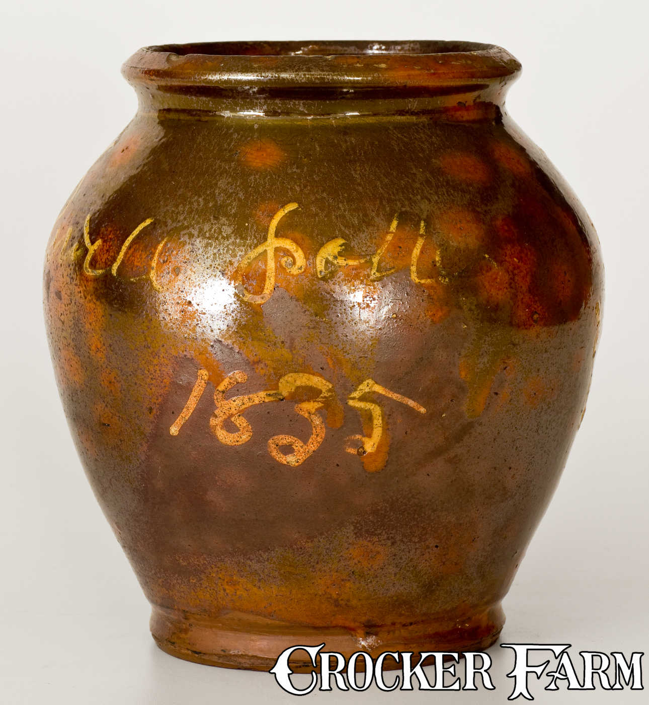 Extremely Rare Slip-Decorated Redware Jar, Inscribed "Lemuel Rowell potter / 1835," Galesville, NY, 1835, ovoid jar with footed base and semi-rounded rim, decorated with the yellow-slip inscription, "Lemuel Rowell potter / 1835," on the front and a wavy, yellow-slip foliate device on the reverse. Lead-glazed surface with appealing orange spotting against a mottled ground. A manufacturer of both redware and stoneware, Rowell is documented in Ketchum's Potters and Potteries of New York State as operating a pottery in Galesville, NY. Until the discovery of this jar, no signed examples of his work were known. Ownership of his pottery was succeeded by the more-well-known stoneware producers, Otto V. and W.A. Lewis. As relatively few signed examples of redware from this state have survived, this jar ranks among the most important examples of New York redware to come to auction in years. Very nice condition with small losses to slip, a small rim chip, and expected light wear to interior of rim. H 7 3/4".