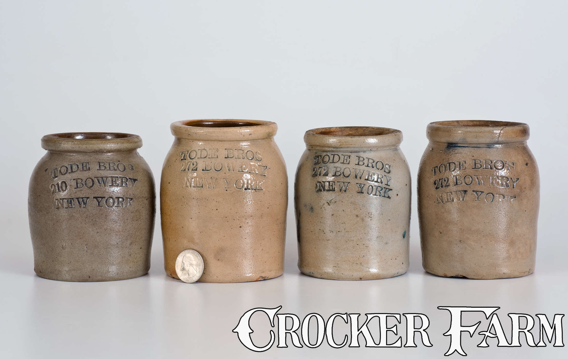 Four Small-Sized TODE BROS / 210 BOWERY / NEW YORK Stoneware Condiment Jars