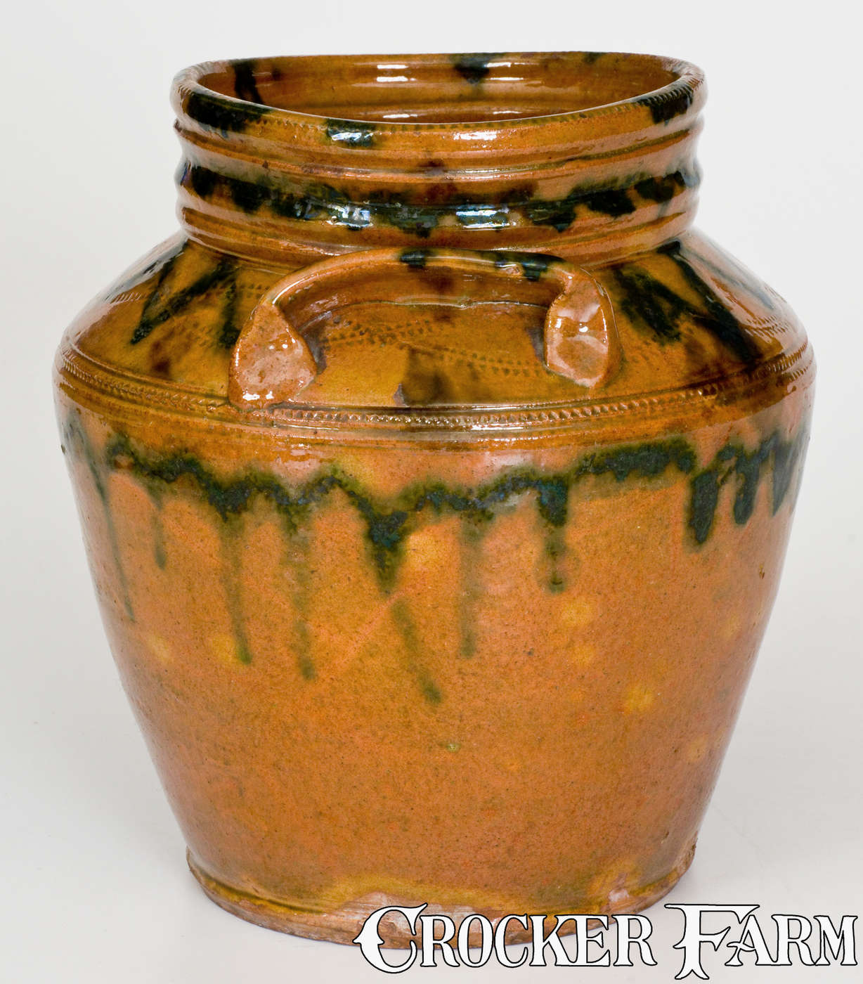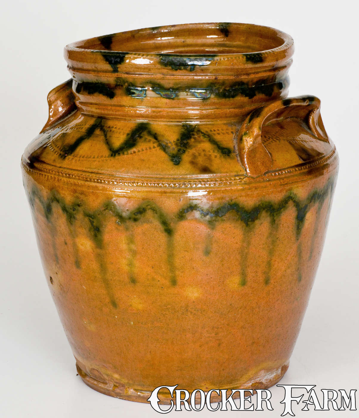 Outstanding Glazed Redware Jar with Copper Slip Decoration, attributed to Edward William Farrar, Middlebury, VT, circa 1825-1835, ovoid jar with angled shoulder, tall, heavily-tooled collar, and ribbed lug handles with depressed terminals. Shoulder decorated with elaborate sawtoothed coggled decoration in a crossing pattern above a circumferential band of the same coggling. This treatment also appears along the top edge of the rim. Slip-trailed copper wavy line decoration to shoulder, midsection, and collar. Manganese spot decoration to shoulder and copper touches to rim. Surface covered in a clear lead glaze over a colorful, mottled-orange ground. Farrar's redware jars rank among the most elaborately thrown and decorated examples of the form in all of New England redware. A related example with draped copper slip-trailing resides in the collection of the Art Institute of Chicago. Provenance: From a recently-surfaced CA collection. Very nice condition. A 3" crack from rim. A 1 3/8" Y-shaped line on underside, forming a 1" tall Y at base, not visible on interior. The glaze survives in remarkable condition with minimal wear and no flakes. H 8 1/2".
