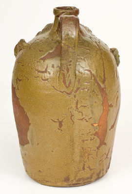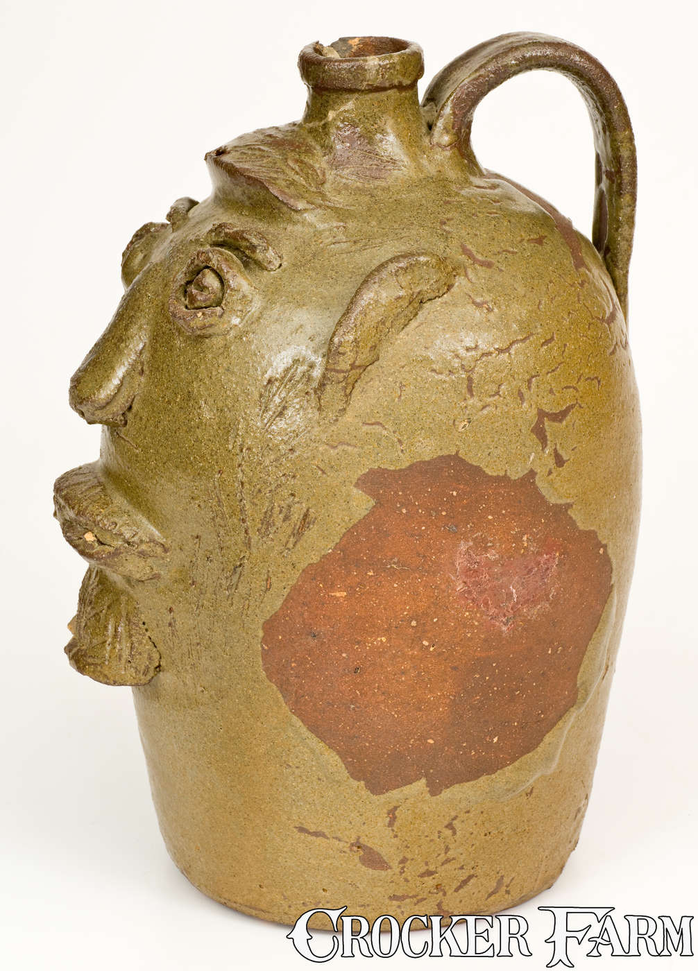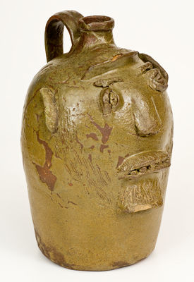 Rare Alkaline-Glazed Stoneware Face Jug, Southern U.S. origin, fourth quarter 19th century, ovoid jug with squared spout molding and thin strap handle, the front decorated with a hand-modeled and applied clay face, including eyes, eyebrows, oblong forehead, ears, nose with pierced nostrils, mouth with applied clay teeth, and elongated chin. Incised beard and hair on top of figure's head. Additional incised details to pupils, eyelashes, and eyebrows. Surface covered in an olive-green alkaline glaze with in-the-firing voids. The refined potting of this jug forms an intriguing juxtaposition with the face's stylized features. The face shows asymmetry in its design, a trait also exhibited in some Edgefield face vessels. In this instance, one eye is placed vertically and one ear is reversed. Strong folk art appeal and unusually large size for its age and origin. A long, thin crack to base area on reverse. In-the-firing flakes to underside at edge. Exfoliation to underside. A 1 1/2" x 7/8" reglued section to spout. Spout chip. One ear appears to be reglued, including painted touch-up along the edge of the ear. Chip to chin. A restored 1 1/2" hole to the large unglazed area on the right side of the jug. An in-the-firing ping to forehead. H 11".