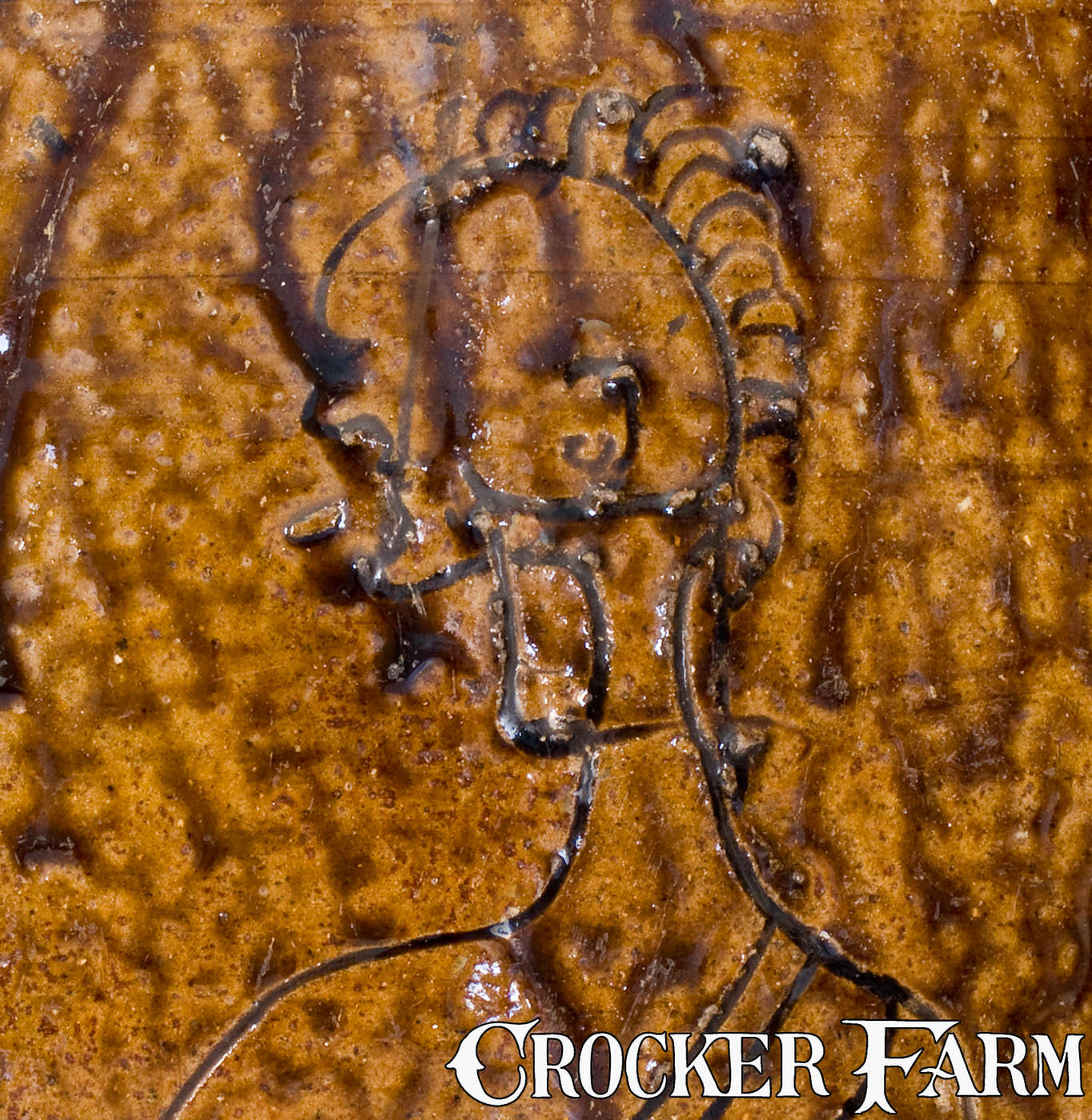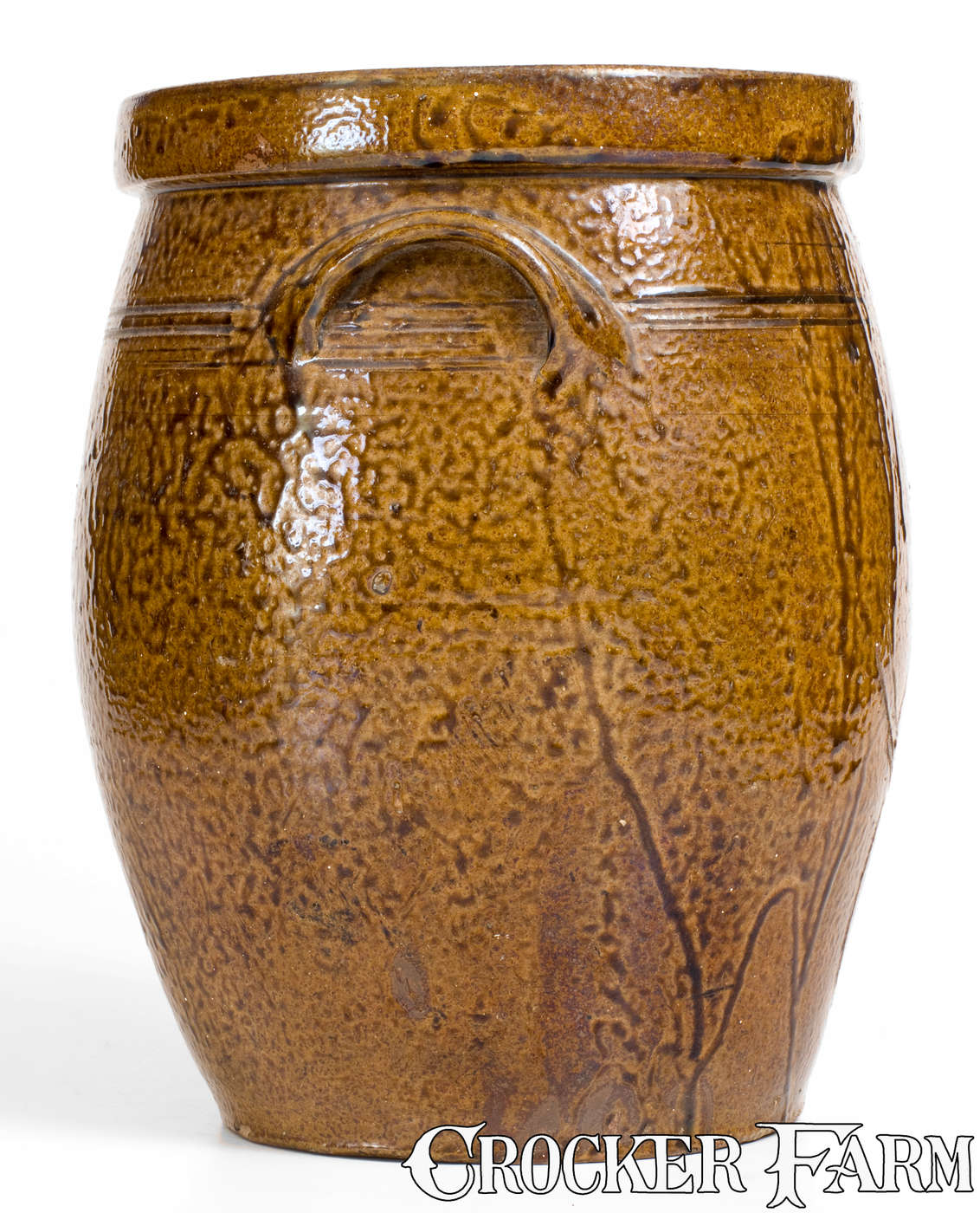 Exceedingly Rare Two-Gallon Alkaline-Glazed Stoneware Jar with Incised Native American Decoration, Southern U.S., possibly Jefferson S. Nash Pottery or Milligan Frazier, Marion County, TX, second half 19th century, ovoid jar with tooled shoulder, squared rim, and arched lug handles, decorated with a stylized, incised design of a Native American's torso with mohawk, earring, and necklace. Surface and underside covered in a streaky brown alkaline glaze. Mysterious in its form, the glaze on this jar most closely resembles that found on pieces made at the pottery of Jefferson S. Nash in Marion County, TX, circa 1850-1860. The African-American potter, Milligan Frazier (ca. 1848-after 1910), was an associate of Nash, who established his own pottery in Marion County during the late 19th century, using a similar brown alkaline glaze produced, in part, from locally-sourced glass bottles. Appealing in form and glaze, this work is significant in its incised depiction of the human form. While incised decoration was frequent among early Northeastern salt-glazed stoneware potters, such treatment is highly unusual in the alkaline-glazed tradition. Very nice condition with a few base chips and two faint hairlines from rim on reverse, measuring 5" and 3". H 11 5/8".