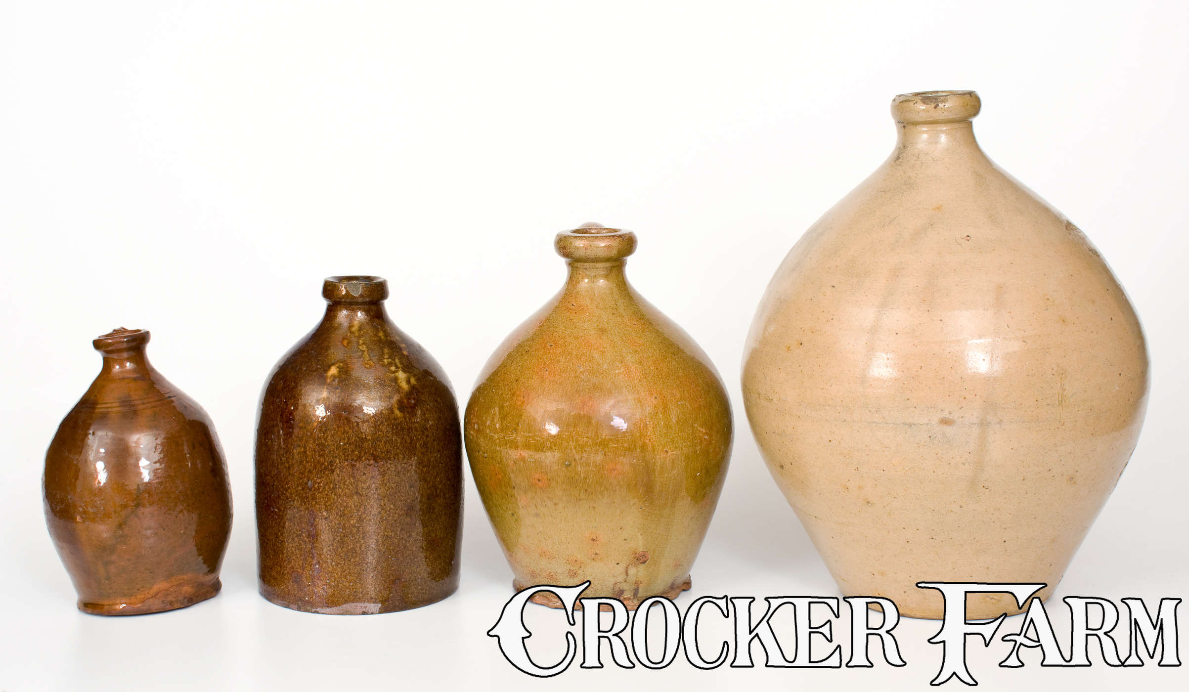 Four Glazed Redware Jugs, Northeastern U.S. origin, second or third quarter 19th century, a large-sized ovoid jug with whitish, lead-base glaze over a light clay ground, probably NY State origin; an ovoid jug with green-and-orange lead-glazed surface, probably NY State origin; a semi-ovoid jug with lead-and-manganese glaze, possibly NY State; and a small, ovoid jug with a mottled orange lead-glazed surface. Smallest with drilled hole in underside, base chips, a spout chip and a few minor spout nicks, wear to midsection, the handle with a chip, a nick, and a 3/4" worn section. Brown-glazed jug with a spout chip, a few very minor spout nicks, and small base chips. Green-and-orange jug with heavy chipping to base and a long circular crack around underside, indicating the base is possibly reglued, as well as a small spout chip and light wear around the midsection. Largest with some small surface flakes and a 1 1/4" crack to reverse of spout, some in-the-firing contact marks to surface, and minor in-the-firing surface fissures at base. H (of smallest) 7 1/2".