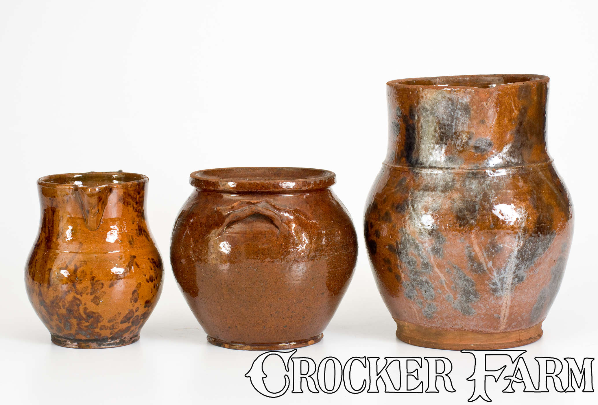 Three Glazed Redware Articles, PA origin, late 18th and/or 19th century, an ovoid jar with lead-and-manganese glaze and distinctive crimped handles related to the work of Christian Klinker, Bucks County, PA, late 18th or early 19th century; a small-sized, manganese-decorated pitcher with applied spout and early tin make-do handle, 19th century; and an ovoid pitcher with manganese decoration, second half 19th century. Provenance: The Estate of Susan H. Myers, author of Handcraft to Industry and former Smithsonian Curator of Ceramics and Glass. Jar with base chips and wear to handles and rim. Small pitcher with two rim chips, some minor rim and spout wear, and separation at the lower terminal of the tin handle. Larger pitcher with wear to rim, spout, and handle, one spout chip, two small base chips, and a short line on underside, continuing a short distance up base. H (of jar) 5 1/4" ; H (of taller pitcher) 7 3/4".