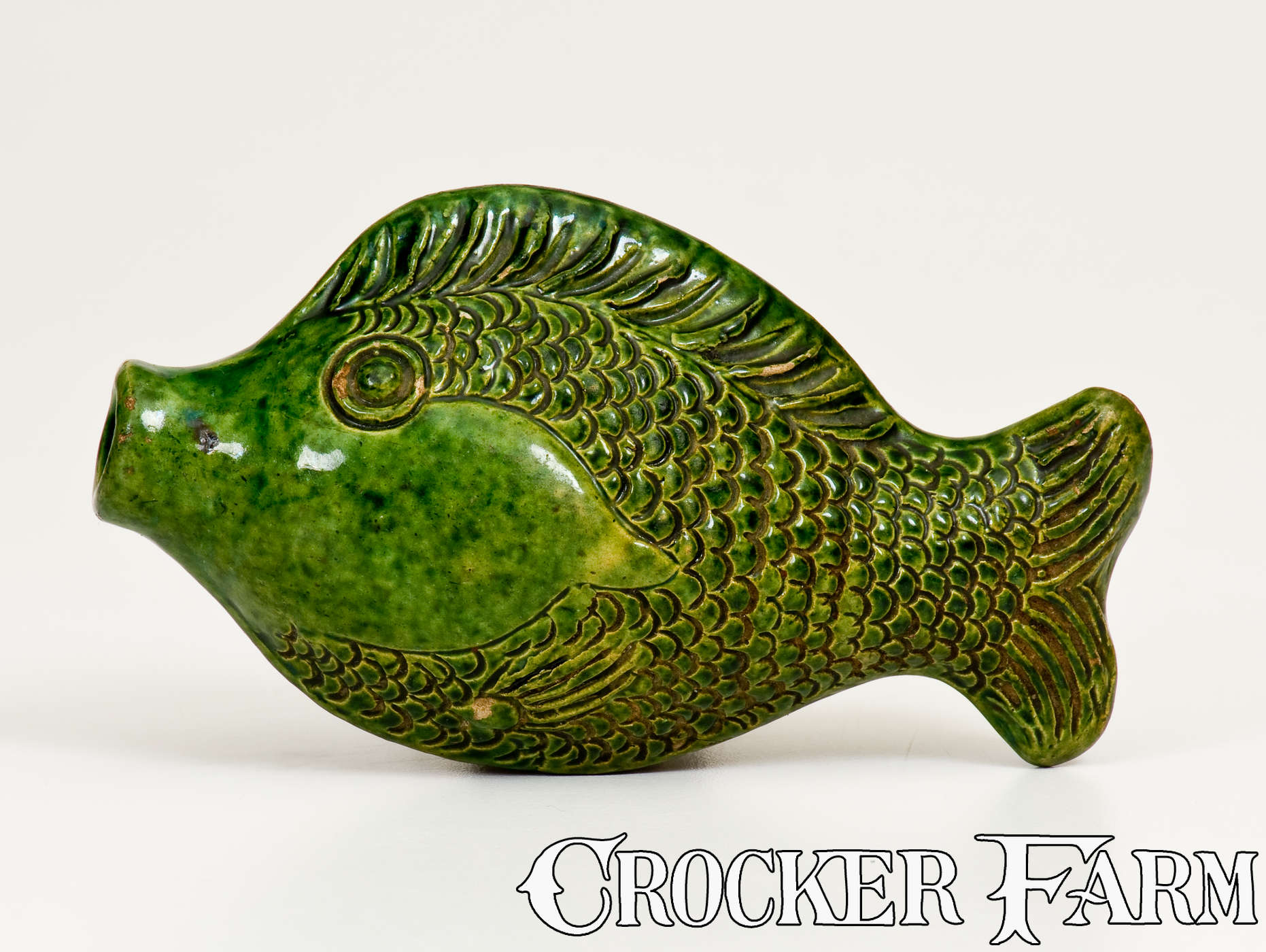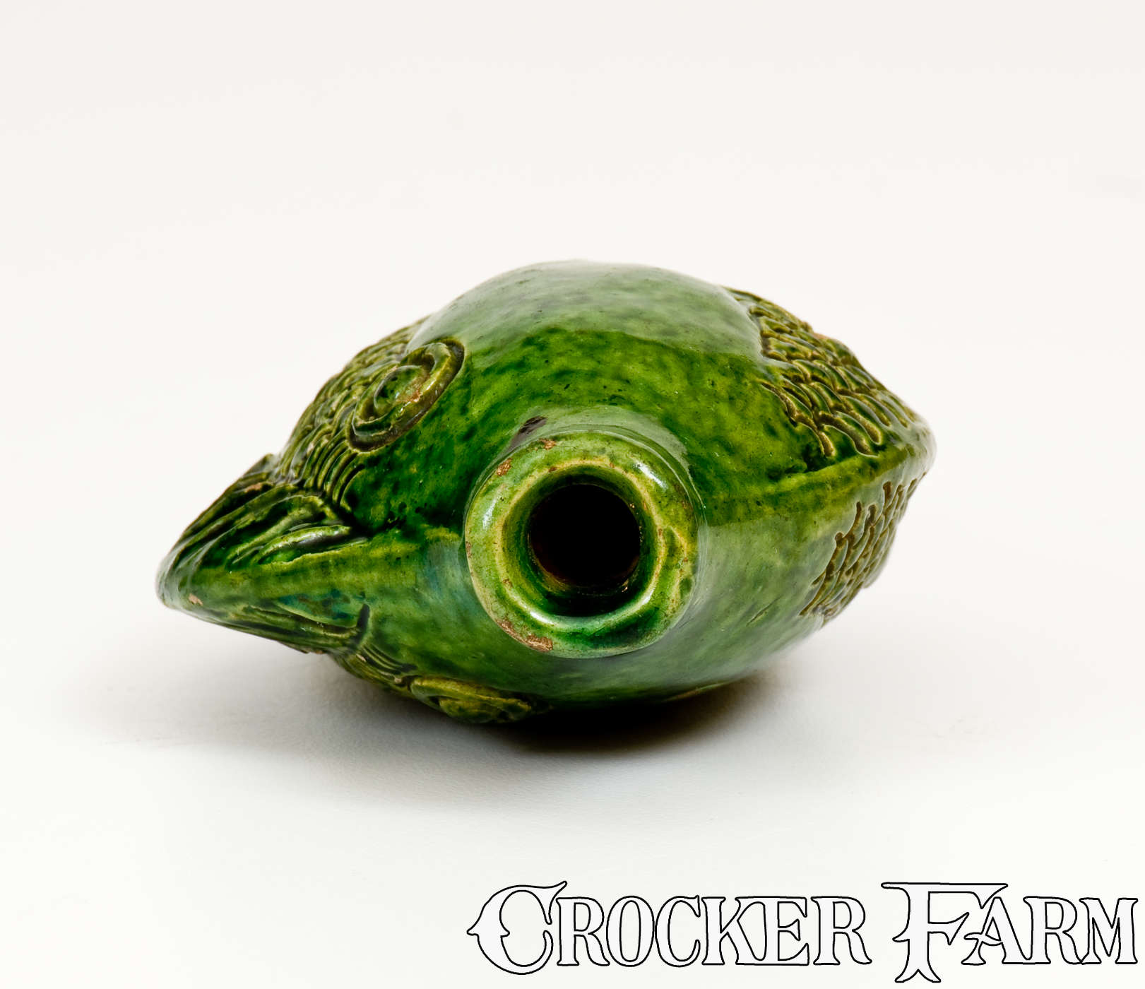 Rare and Fine Small-Sized Redware Fish Bottle with Copper Glaze, Salem, NC origin, circa 1801-1829, molded bottle in the form of a fish with large, circular eyes and heavily-detailed scales and fins, the animal's mouth forming the vessel's spout. Surface covered in a mottled green lead-and-copper glaze. This example is molded in the smallest size known for this form. It survives in remarkable condition, retaining a strong luster to the surface and particularly crisp detail throughout, including deep, tactile scaling. Literature: A different fish bottle of the same size is discussed by Johanna Brown in her Ceramics in America 2009 article, "Tradition and Adaptation in Moravian Press-Molded Earthenware." Brown writes, "[The] smallest fish bottles might have been marketed as presents and toys. The example illustrated at the far right in figure 27 belonged to Alethea Fluke, a Quaker who lived in Guilford County, North Carolina. When Alethea gave the bottle to her grandson in 1889, she included a note stating: 'My dear old companion we have been together 86 years I now bid thee a final farewell I give it to my grand son Trenmor Coffin in my 92nd year may it remain as long in his family as it has with me 8th mo 30th 1889 Alethea Coffin.' Assuming that her recollection was correct, Alethea's father purchased the bottle about 1803." Provenance: Ex-Waynick Collection, Old Salem, NC. Excellent condition with minor wear, the one side with small kiln furniture marks. L 4 1/2".