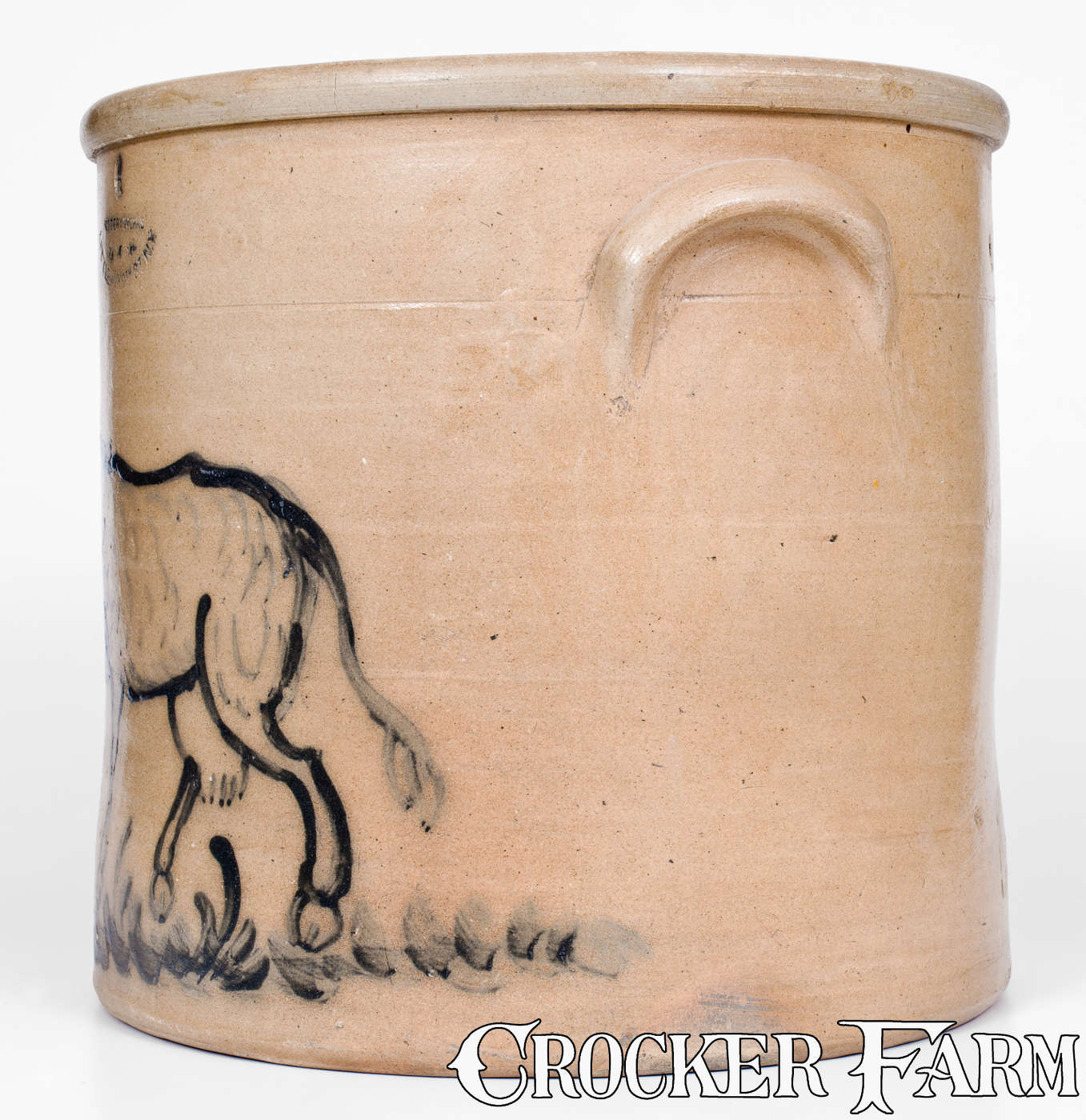 Outstanding Six-Gallon Stoneware Crock with Large Cobalt Cow Decoration, Stamped "POTTERY WORKS / LITTLE WST 12TH ST. N.Y.," William A. MacQuoid, Manhattan, NY, circa 1870, large-sized, cylindrical crock with tooled shoulder, semi-rounded rim, and applied lug handles, brush-decorated with a design of a trotting cow with horns and udder, elaborate ground cover below, and pine tree in the distance. Cobalt highlights to maker's mark and capacity mark. This crock's painterly rendering of a cow is among the largest and most-detailed depictions of this subject known in American stoneware, the animal measuring approximately 9 1/2" in length. This work, potted in an exceptionally large size, typifies Macquoid's artistic approach to stoneware decoration and interest in unusual animal and human forms. An approximately 5" crack from rim above rear end of cow. An approximately 3" crack from rim on far left side of crock's front. In-the-firing, glazed-over surface lines at base on reverse, not visible on interior. A small in-the-firing iron ping at shoulder on reverse. H 12 3/4".