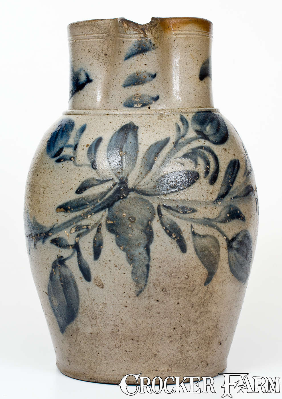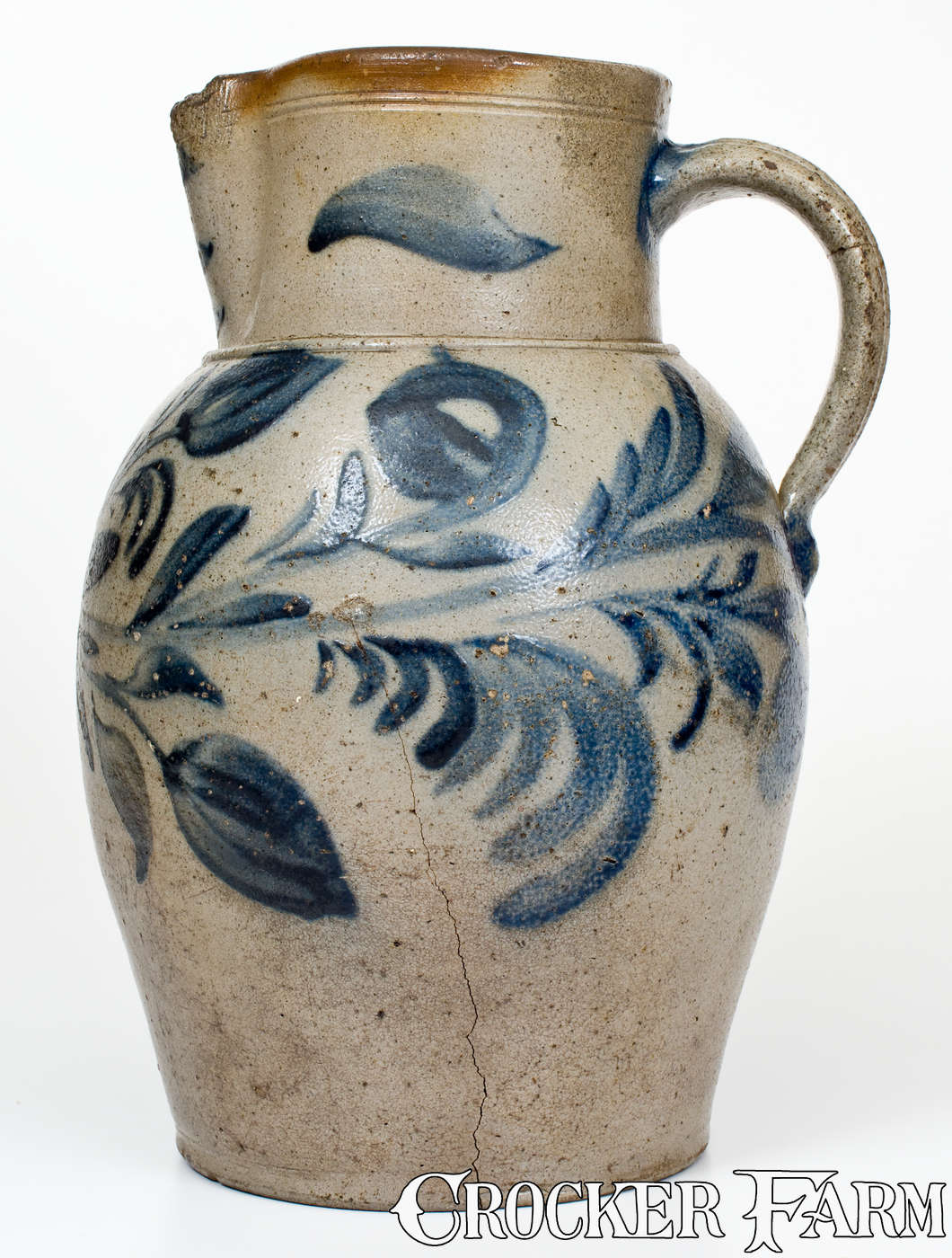 Exceptional Early-Period Shenandoah Valley Stoneware Pitcher with Profuse Cobalt Floral Decoration, attributed to Philip Byers, Strasburg, VA origin, circa 1840, ovoid pitcher with tooled rim and ribbed handle, brush-decorated with a central, turnip-shaped design with elaborate, outwardly-branching vines bearing oval and circular flower blossoms. The extensive brushwork continues around the sides of the pitcher and meets at the base of the handle. Dash decoration to spout and broad strokes to the sides of the collar. Cobalt highlights to handle terminals. Shoulder impressed with distinctive raised-face two-gallon capacity mark, in the same series as that found on a one-gallon jar bearing the cobalt inscription, "P Byers 1841," sold as lot 318 in Crocker Farm's May 21, 2005 auction. The history of Philip Byers' career as a potter is outlined in H.E. Comstock's The Pottery of the Shenandoah Valley Region, pp. 381-382. According to Comstock, Byers was apprenticed to Peter Bell in 1823 and by 1831 was probably producing earthenware with Peter Bell and stoneware with William Miller of Strasburg. Byers also may have been the impetus for Peter Bell's venture into stoneware production in 1832. Later in 1832, Byers established a pottery in Rockingham County, VA. By 1839, Byers was working with William Miller's son, John, in Strasburg. Byers began managing the former Miller pottery of Strasburg around 1840, and hired Samuel Bell on occasion to produce some of his ware. According to Comstock, Byers may have persuaded Samuel Bell to move to Strasburg, where Bell and his sons would produce stoneware and redware for the next fifty years. Despite Byers's important role in the Shenandoah Valley potting industry, very few signed or attributed examples of his work are known. This pitcher's capacity mark and unusual, Miller-inspired brushwork lead to a firm attribution to his hand. The significance of this work is compounded by the unusually-elaborate decoration, ranking it among the most heavily-decorated Strasburg stoneware pitchers known. In-the-making damage to top of spout, which is partially glazed over. A chip to interior of spout. Two tiny rim chips. A thin X-shaped crack on underside, including a crack that extends 7" up side of pitcher. A horizontal crack through handle. Some wear to cobalt. A minor, 1 3/4" spider line to one side. Some light staining. H 13 1/2".