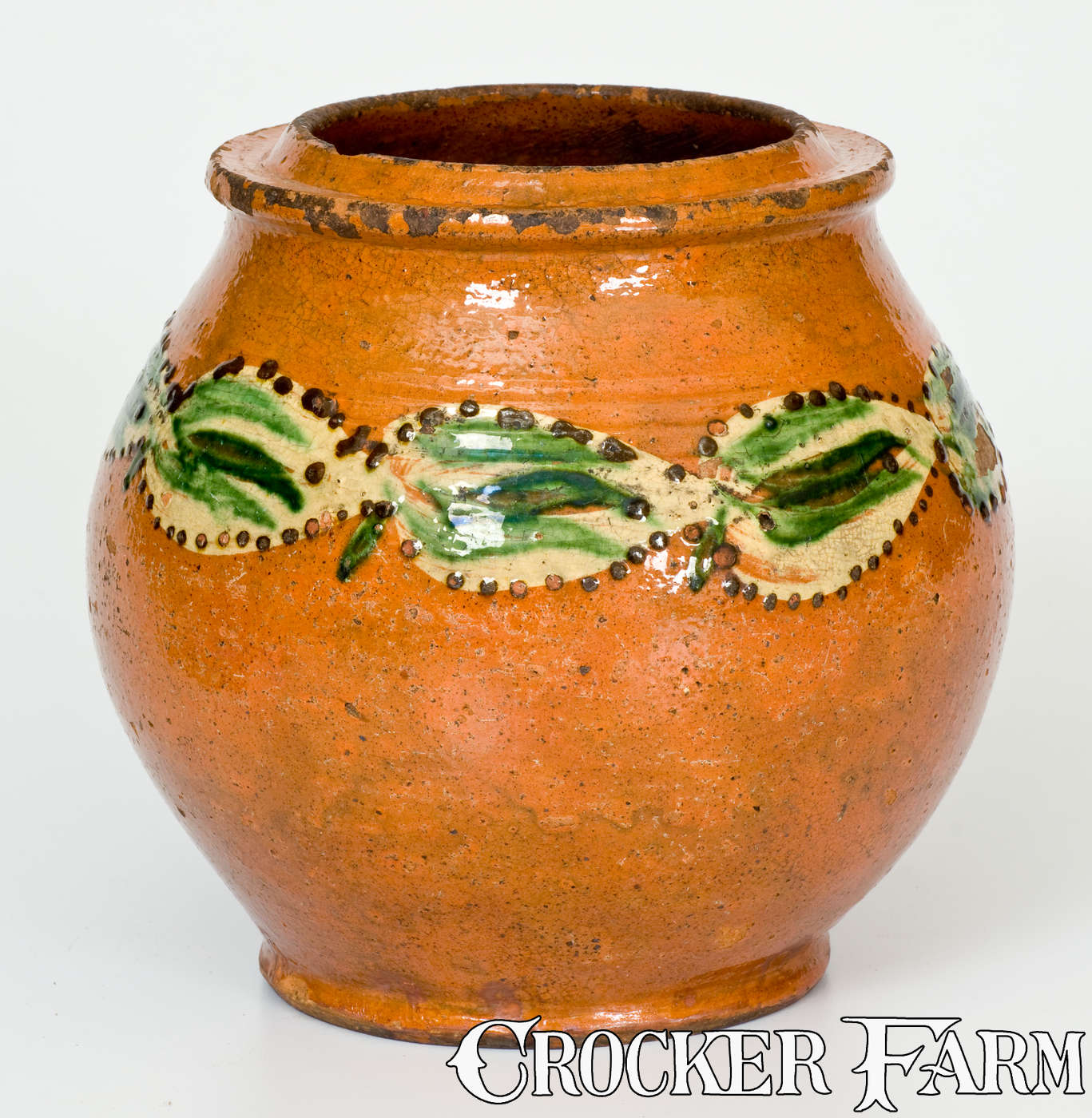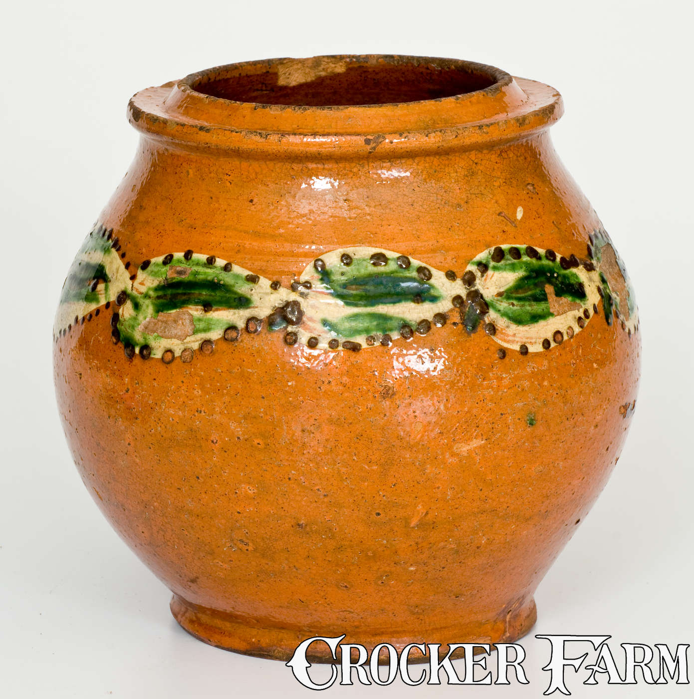 Extremely Rare Ovoid Redware Jar with Three-Color Slip Tulip Decoration, attributed to Jacob Foulk, Jr., Frederick County, VA or Morgantown, VA (now WV) or Samuel Butter, Morgantown or Clarksburg, VA (now WV), late 18th or early 19th century, highly-ovoid jar with footed base, tooled shoulder, and raised rim molding, decorated around the shoulder with brushed copper-slip tulips surrounded by cream-colored slip and bordered by slip-trailed manganese spots. Interior and exterior surface covered in a clear lead glaze. This recently-surfaced jar bears a distinctive spotted tulip motif found on a jar attributed to Samuel Butter of Clarksburg, Virginia, circa 1820, which resides in the collection of the National Museum of American History and is pictured and discussed in Donald Horvath and Richard Duez's Ceramics in America 2004 article, "The Potters and Potteries of Morgan's Town, Virginia: The Earthenware Years, Circa 1796-1854". Butter apprenticed to Jacob Foulk, Jr., a Morgantown, Virginia potter who also employed similar tulip motifs in multi-color slip. Before 1802, Foulk was active in Frederick County, VA, as noted by H.E. Comstock in his book, The Pottery of the Shenandoah Valley Region. The original discovery of this jar just north of Harrisonburg, Virginia, approximately seventy miles south of Foulk's Frederick County pottery site, offers the possibility that this piece may actually be a very early Shenandoah Valley of Virginia product, made by Foulk prior to his Morgantown venture. A jar by the same hand, sold as lot #511 in Sotheby's sale, "Visual Grace: Important Folk Art From the Collection of Ralph O. Esmerian", carried an attribution (which we believe to be erroneous) to Christian Klinker of Bucks County, PA. It had been acquired by Joe Kindig, Jr. in 1971, a dealer known for acquiring objects further south. Slip-decorated redware of the Morgantown school is considered extremely rare and few examples have come to market in recent years. Literature: For a jar by the same maker, see American Radiance: The Ralph Esmerian Gift to the American Folk Art Museum, p. 130, fig. 90. Some losses to slip. A 7/8" chip to interior of rim. Some glaze wear and a small, shallow chip to exterior of rim. H 6 1/2".