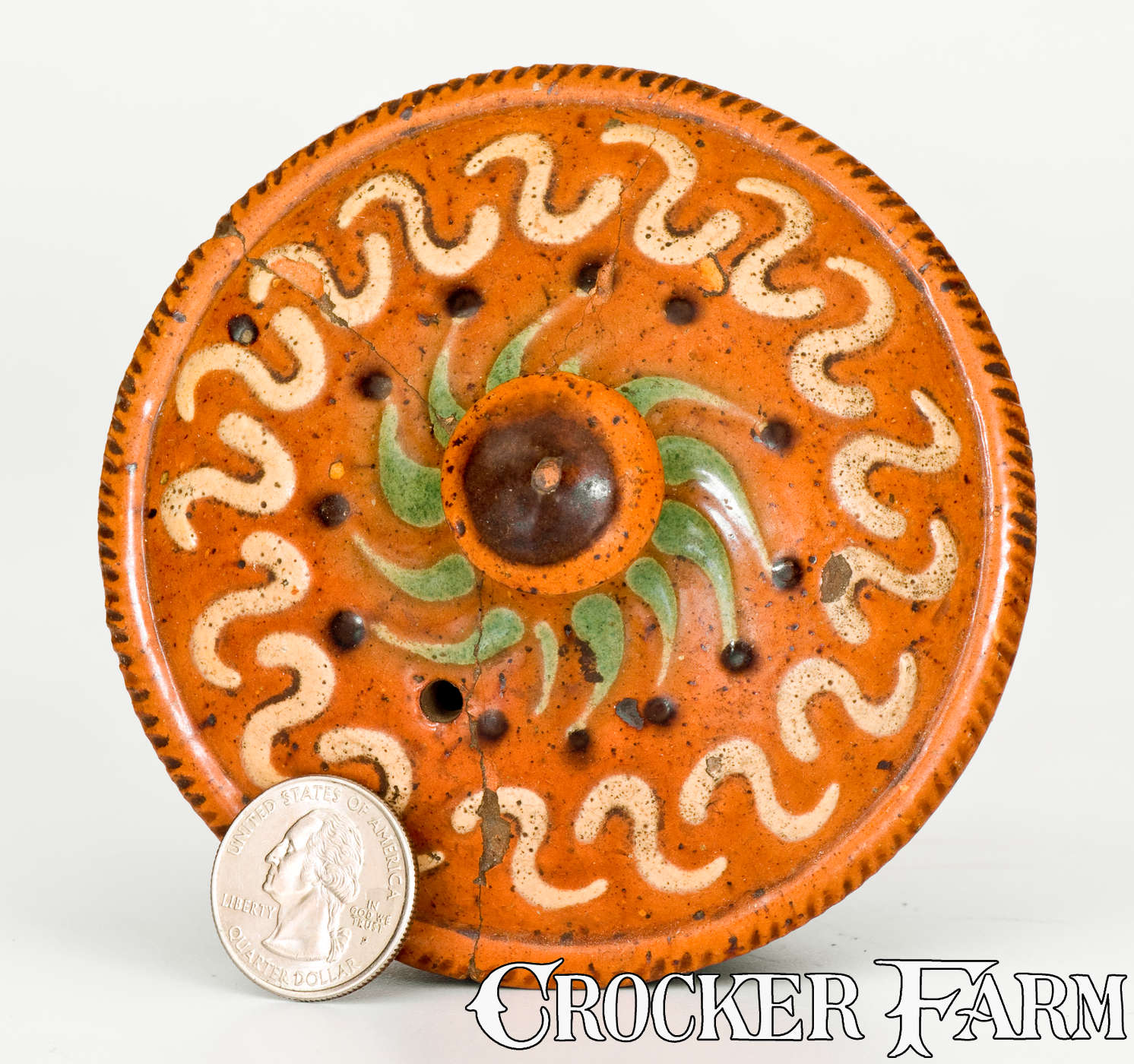 Rare Redware Lid w/ Elaborate Three-Color Slip Decoration