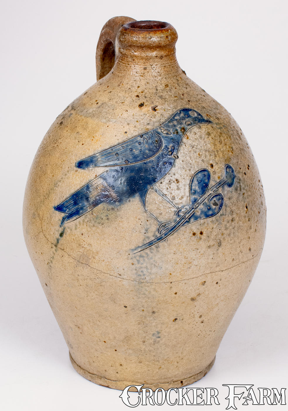 Scarce Manhattan, NY Stoneware Jug w/ Fine Incised Bird Decoration, circa 1790