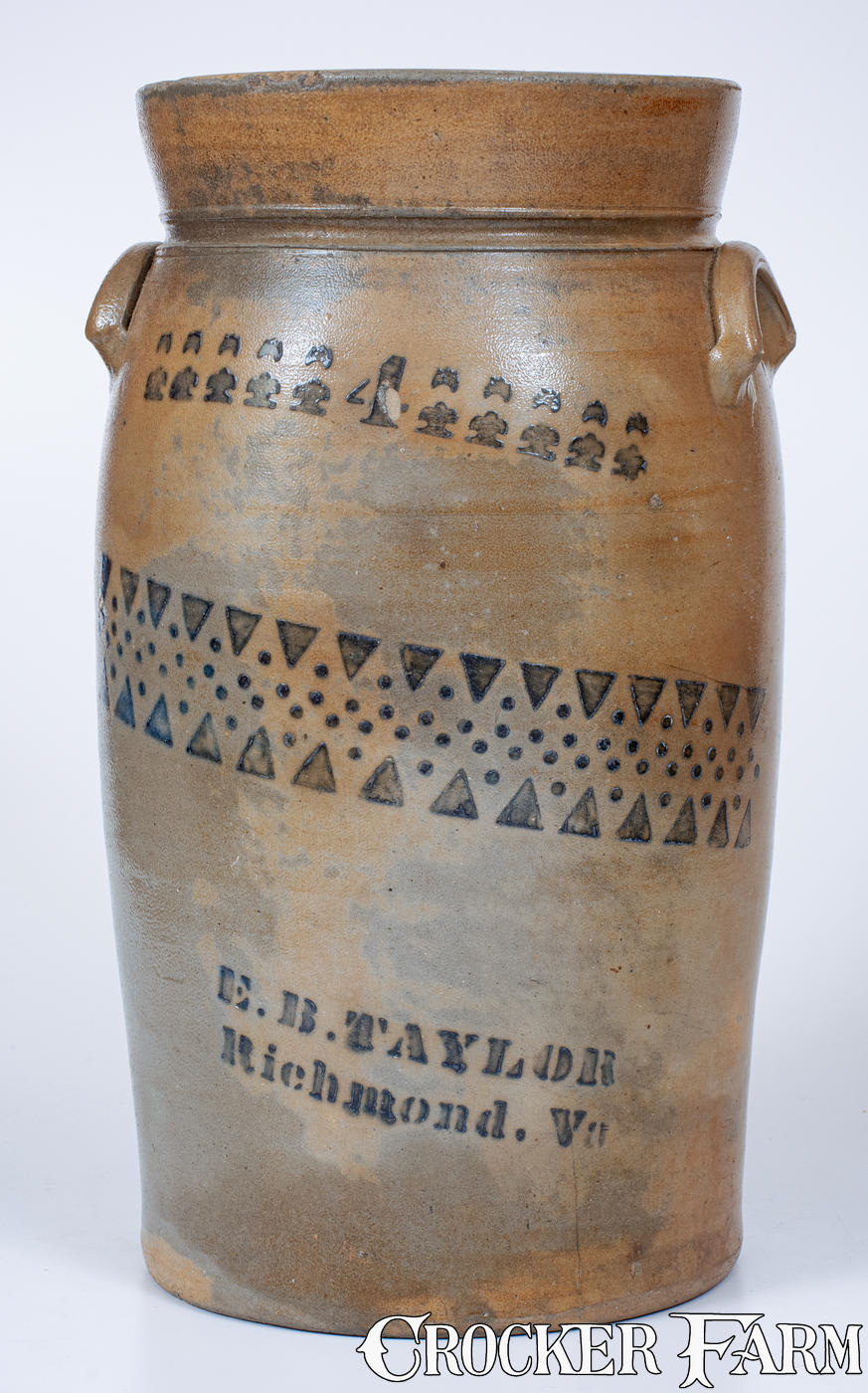 4 Gal. E. B. TAYLOR / RICHMOND, VA Stoneware Churn att. Donaghho / Parkersburg, WV
