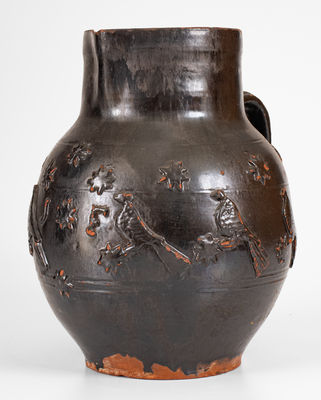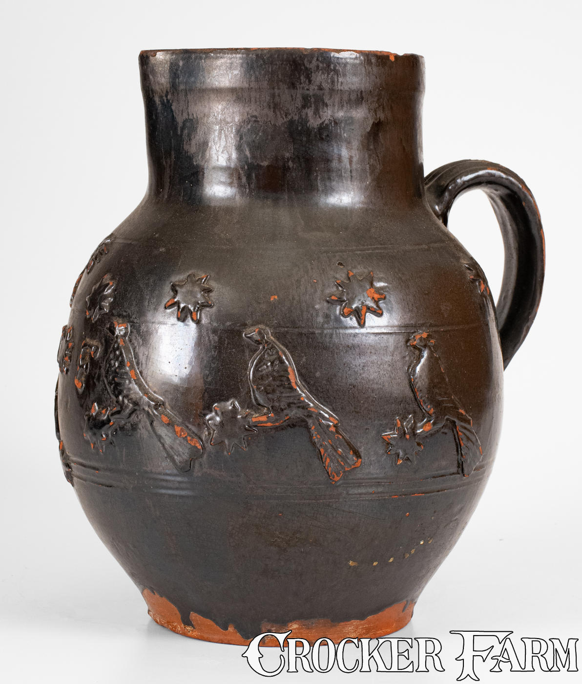 Outstanding Glazed Redware Pitcher with Applied Bird and Star Motifs, Initialed "J F," probably Philadelphia, PA origin, early 19th century, ovoid pitcher with squared rim, tooled banding, and extruded handle, the midsection decorated with a series of sprig-molded and applied birds perched on eight-pointed stars. Four birds include crests, while two were fashioned and glazed without them. Subtly-different hand-incised details accent the birds and some of the stars. The initials, "J F," referring to either the maker or owner of the pitcher, are applied to the front, flanking a star. Surface covered in a black lead-and-manganese glaze, modeled after English Jackfield pottery. The glaze, clay color, and form, suggest a Philadelphia origin. A beautifully potted and decorated work from an early period. A 1 1/4" chip to left edge of spout, primarily visible on interior. A 7/8" chip to interior of rim. Wear to rim, handle, and areas of applied decoration. Minor, very old base chips. H 11".
