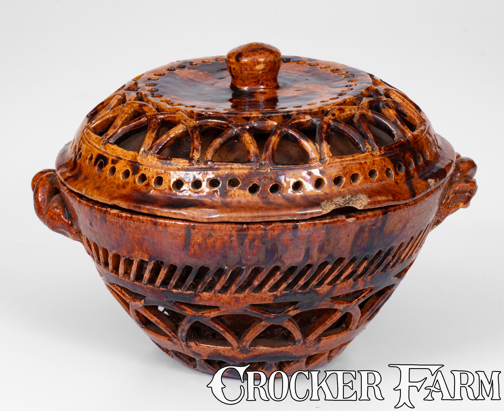 Very Unusual Pierced Work Pennsylvania Redware Lidded Sugar Bowl