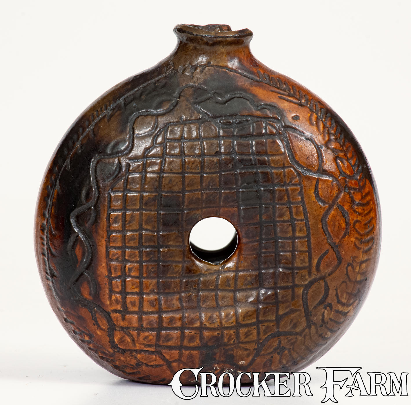 Rare Glazed Redware Ring Flask w/ Elaborate Incised Decoration, probably PA, late 18th or early 19th century