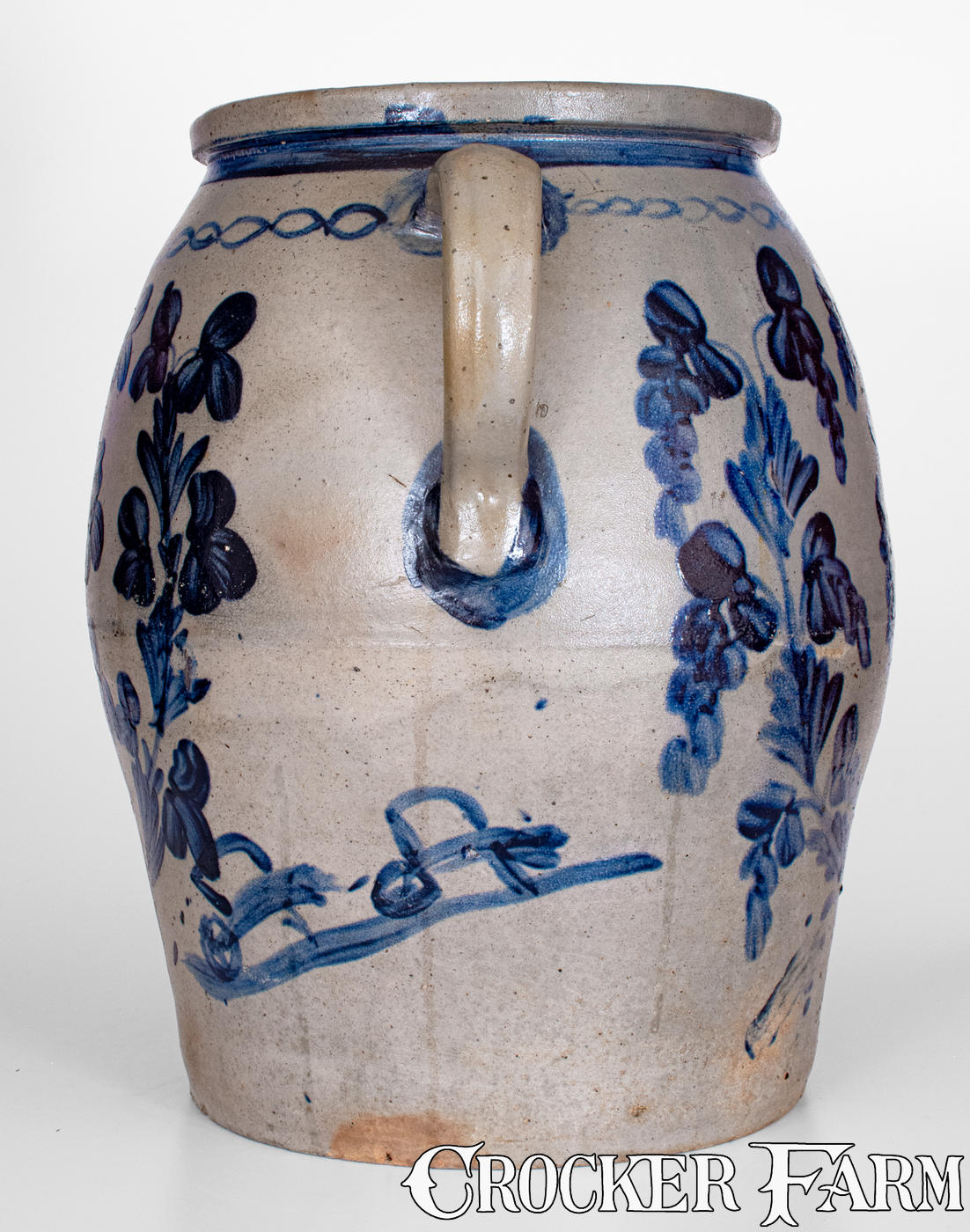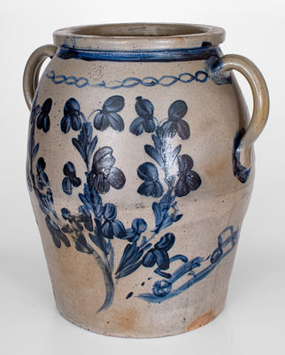 Monumental Ten-Gallon Stoneware Jar with Profuse Cobalt Clover, Chainlink, and Wheelbarrow Decorations, Baltimore, MD origin, circa 1840, ovoid jar with squared rim and vertical open handles, lavishly-decorated on the front and reverse with a large triple-stemmed flowering plant extending from base to shoulder. One side depicts the plant bearing classic Baltimore clover designs and the other side depicts a clover variant resembling wisteria, another popular regional motif. A highly unusual design of two wheelbarrows descending a hill to the base of each plant appears on opposing sides below the handles. Shoulder decorated on each side with a brushed cobalt band above a series of chain links. Circular cobalt brushwork highlights the handle terminals. Impressed "10" within a dashed circular border. Featuring an imposing size and unusual double-handled form, this jar is among the most heavily-decorated examples of Baltimore clover-decorated stoneware known. Putting this work in a class unto itself is the addition of wheelbarrow motifs flanking the plants, images which speak to the vessel's use in an agrarian context on a Virginia farm. While the vessel's exact purpose is unknown, its special size may relate it to the large "plantation jars" produced in alkaline-glazed ware further South. Provenance: Originally owned by the Coons Family, North Cliff Farm, Culpeper, VA; later owned by a Charlottesville, VA lady; Jeffrey S. Evans & Associates Auctions, Nov. 14, 2009, lot 20. One handle professionally-restored. Otherwise excellent condition with the following minor flaws: a vertical in-the-firing glaze drip to one side, some staining, minor base chips, and an area of short tight lines from rim. H 19".