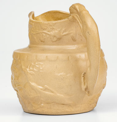 Exceptional Small-Sized Stoneware Hunt Scene Pitcher, Stamped "*D & J HENDERSON / Jersey City," NJ origin, circa 1829-1833, molded pitcher with hound-form handle, glazed interior, and lightly-glazed exterior, the body with relief decoration designed by modeler, Daniel Greatbach, depicting hounds taking down a boar and stag. Hand-incised details to paws of hound handle. Underside impressed with circular Henderson maker's mark along with a relief "I," incised "X," and small incised "C". Pieces produced at this short-lived manufactory represent some of the most high-styled stoneware produced in 19th century America. This pitcher is the only Henderson piece molded in this combined size and form that we have offered, as well as the smallest New Jersey hunt scene pitcher that we have seen. A slightly larger pitcher, standing 6" tall, resides in the collection of the Metropolitan Museum of Art, New York, NY. Excellent, essentially as-made condition. H 5 1/4".