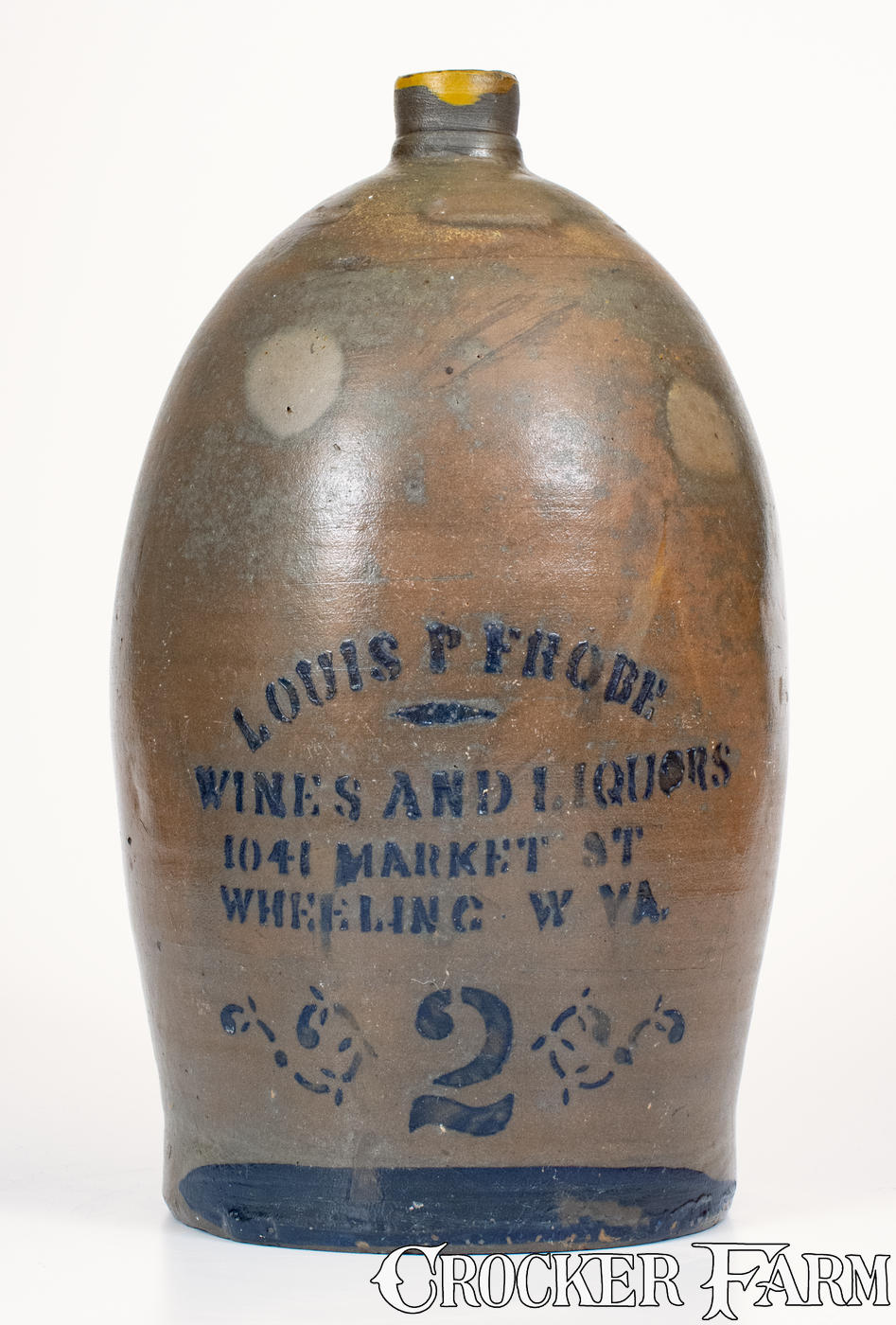 2 Gal. Stoneware Jug w/ WHEELING, W. VA Stenciled Advertising