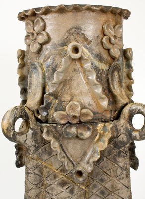 Extremely Rare Salt-Glazed Stoneware Chimney Pot, attributed to Wallace and Cornwall Kirkpatrick, Anna, IL, circa 1875, cylindrical form, wheel-thrown in two separate pieces, featuring a crimped rim and elaborate applied decoration in the form of crimped diamonds, flowers, leaves, and rings. Incised "5" and "X" at shoulder. A highly sculptural work and among the largest Anna Pottery pieces known. Literature: A closely-related chimney top from the same property, Riverlore Mansion, is illustrated in Denker, The Kirkpatricks' Pottery at Anna, Illinois, as well as in Mathis, The Family, Kilns & Stoneware of Kirkpatrick, pg. 281. Provenance: One of three Anna Pottery chimney tops salvaged from the demolition of Riverlore Mansion in Cairo, Ill. Broken into pieces and reglued, including paint along cracks. One ring restored. Some exfoliation. A missing section at the base, now lost, included an Anna Pottery signature and date. Likely missing twisted rings that hung from the applied rings and applied pointed pieces at base. While the other surviving Riverlore Mansion chimney pot includes a crown-like top, an Anna Pottery price list of the period shows this form with and without this third section, indicating this chimney pot may have never included it. H 32 3/4".