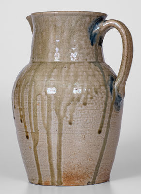 Exceedingly Rare and Important Cobalt-Decorated Stoneware Pitcher, Stamped "S. LOY," Solomon Loy, Alamance County, NC, circa 1855, ovoid, thin-walled pitcher with flared collar, brush-decorated with an arched cobalt highlight over the maker's mark, including a three-petaled flower blossom at the top of the arch and an additional petal-like stroke to its left. Brushed cobalt highlights to handle terminals. Surface covered in a heavy salt glaze. Proficient in both slip-decorated redware and salt-glazed stoneware production, Solomon Loy ranks among the state's most artistic and influential potters. This work is the only signed pitcher by his hand that we have seen. The lavish, flowing salt runs on the vessel's right side are a hallmark of his stoneware pieces. A professionally-restored, approximately 3" x 1" section to left side of rim, including a curving crack descending from it. A 1 1/2" hairline from rim on pitcher's right side, partially visible on interior. Two other shorter, faint surface lines from rim on pitcher's right side, extremely minor and likely in-the-firing. H 11 1/2".