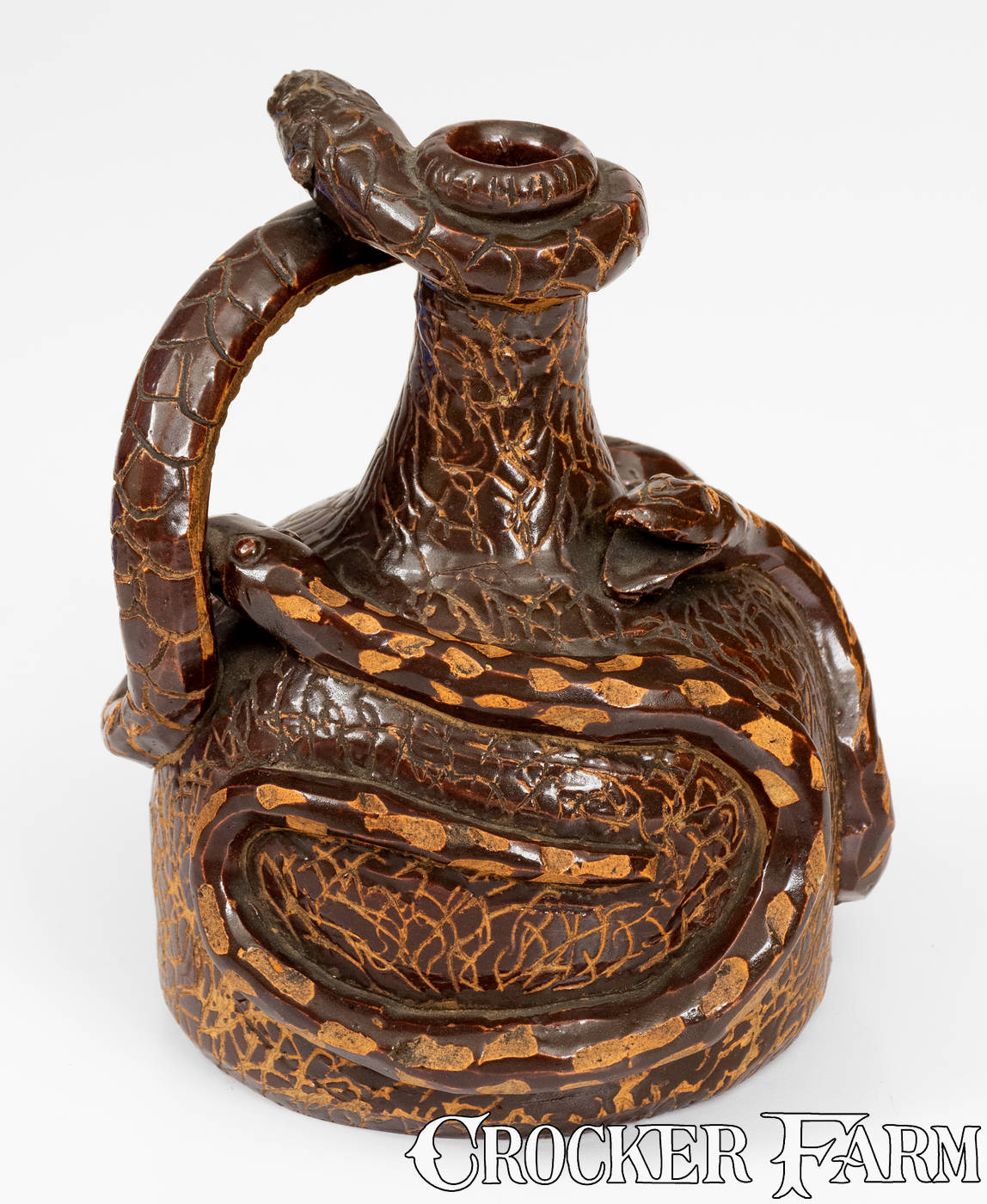 Rare Albany-Slip-Glazed Stoneware Snake Jug, Boonville, Missouri origin, circa 1890