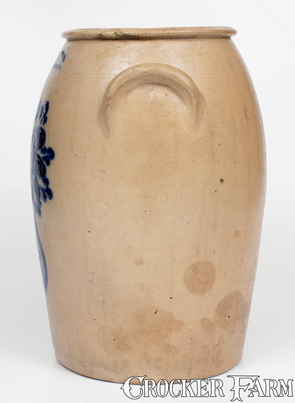 Exceptional Three-Gallon Stoneware Jar with Elaborate Cobalt Floral Decoration, Stamped "T.H. WILLSON & CO. / HARRISBURG.PA," circa 1852-1855, ovoid jar with tooled shoulder, flattened rim, and applied lug handles, decorated with a large slip-trailed design of a flowering plant bearing two blossoms with highlighted tips to the petals, flourishes between the petals, and a curved pinwheel-shaped element to the blossoms' centers. Foliate details to the interior of the leaves and a vigorously-trailed, tornado-shaped device emanating from between the blossoms. Cobalt highlights to maker's mark and capacity mark. Distinctive characteristics of the cobalt design indicate it was executed by Shem Thomas, a Harrisburg potter who had previously worked at the Thompson Harrington shop in Lyons, NY and owned his own pottery in Penn Yan, NY. In this case, as with other early Harrisburg pieces, Thomas is utilizing the slip cup decoration he learned in New York State. Shortly after this jar was made, Thomas would partner with John Young under the partnership "John Young & Co." at Willson's defunct shop on Filbert Street. Featuring exquisite decoration, superb color, and desirable slip-trailed application of the design, this work ranks as arguably the finest example of T.H. Willson stoneware that we have ever offered. Provenance: A fresh-to-the-market example, which recently surfaced in the Mid-Atlantic U.S. A filled 2 1/4" chip to side of rim. Otherwise excellent condition with some staining to sides and reverse. H 14 3/4".